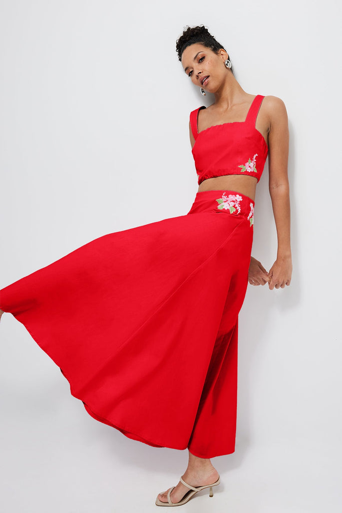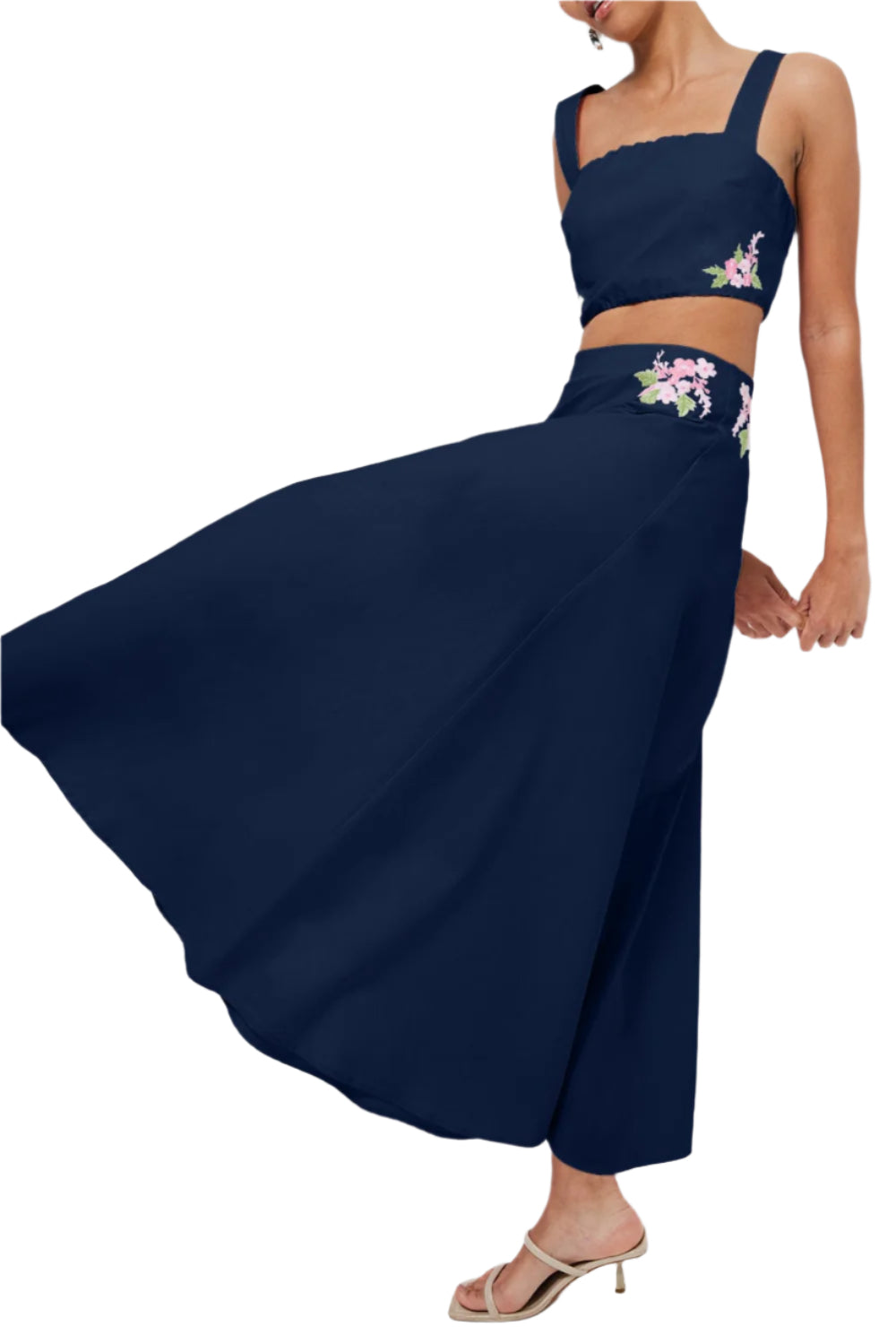 100% cotton. The cropped bralette-style top features floral embroidery, wide straps, a back button closure, and an elasticized edge for comfort. Top length: 15.7". The high-waisted skirt has a flowing A-line silhouette, a hidden back zipper, and matching floral embroidery at the waistband. Skirt length: 37.8".