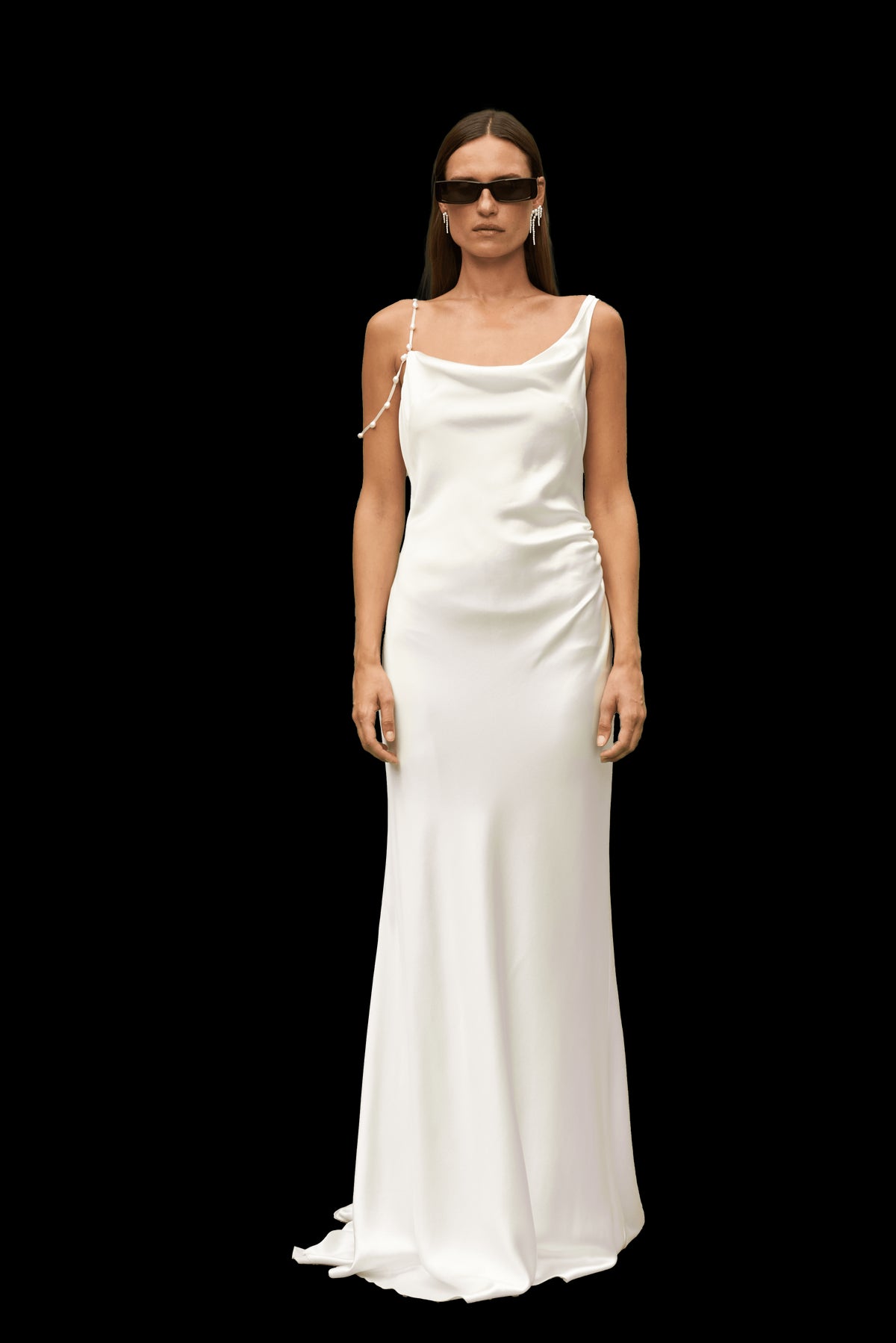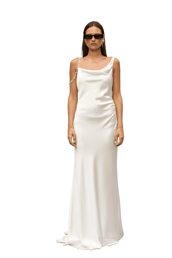Handmade at its London atelier, The OWN Studio’s signature style combines pared-back, contemporary silhouettes with unexpected vintage details resulting in considered, minimal styles for the modern woman. The label brings a fresh and contemporary approach to wedding and evening wear. The Asymmetric Cowl Dress with Pearl Straps | STYLE 019 exudes effortless glamour. Its sweeping asymmetric neckline tumbles into a soft cowl which creates an incredibly soft line across the décolletage, finished by off the shoulder baroque pearl detail. Soft ruching at the waist is incredibly flattering and adds extra definition. A beautiful draped pearl necklace means the back is just as stunning as the front.