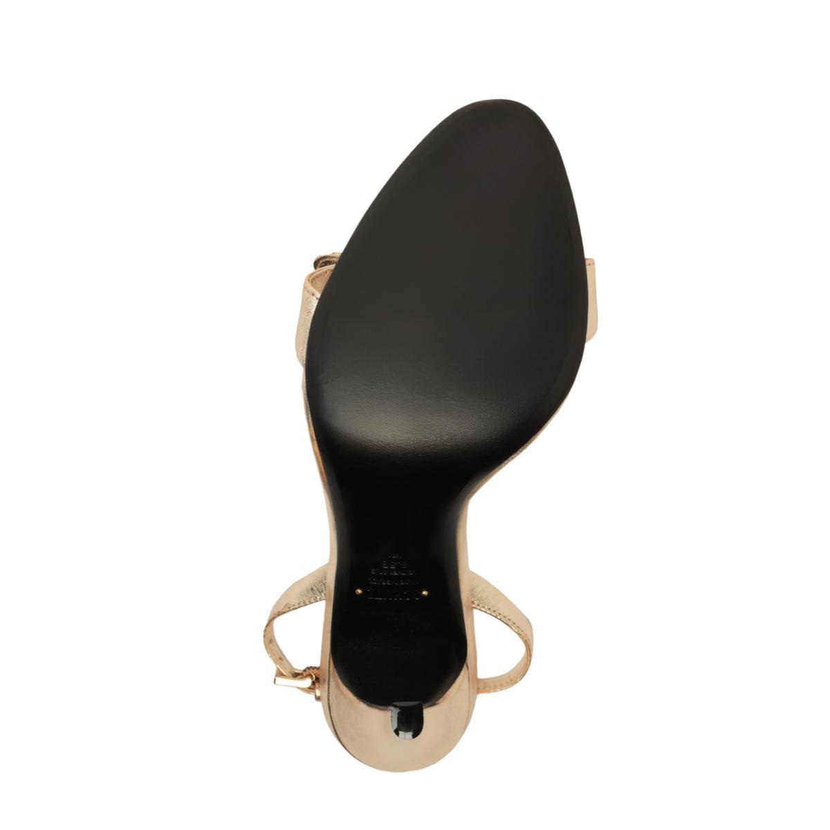 Metallic leather upper. Man-made lining. Man-made sole. Slingback strap. High stiletto heel. Open toe.
