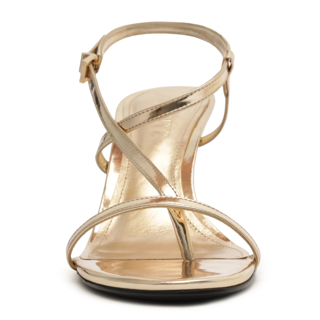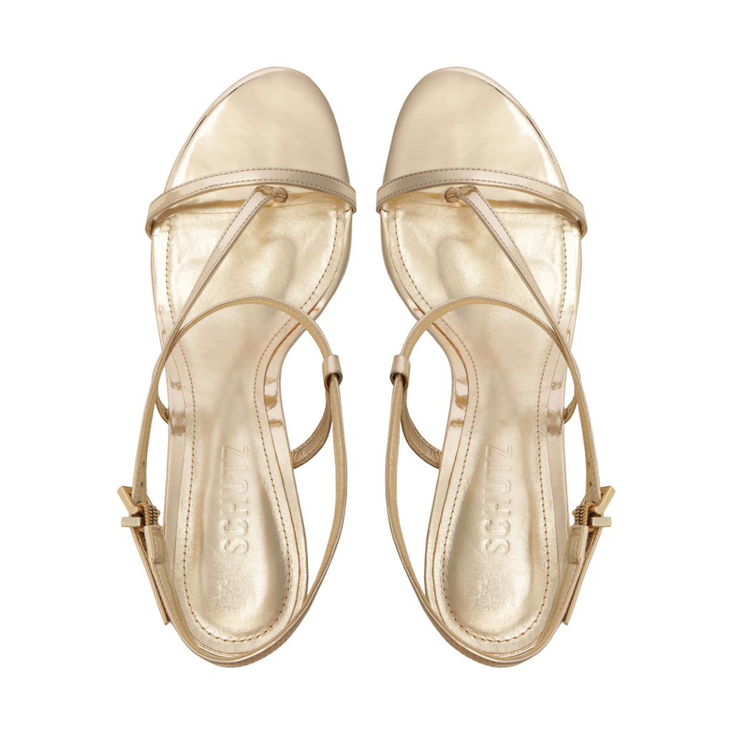 Metallic leather upper. Man-made lining. Man-made sole. Mid stiletto heel. Strappy sandal silhouette.