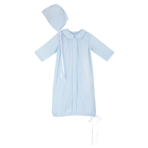 Using artisan seamstresses to craft small orders of their heirloom pieces, Strasburg Children pays special attention to details—French seams, built-in slips, and fabric-covered buttons—for lasting quality and comfort. An adorable option for bringing baby from the hospital or for first portraits, the Baby Day Gown features delicate picot trim around the collar and cuffs, tiny pin tucks, full lining, and a handcrafted embroidered rattle on the center pleat. Our favorite part: mother-of-pearl buttons for added comfort.