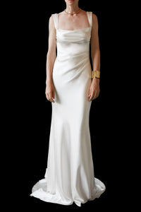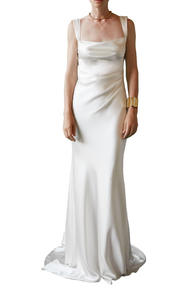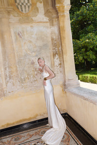 Handmade at its London atelier, The OWN Studio’s signature style combines pared-back, contemporary silhouettes with unexpected vintage details resulting in considered, minimal styles for the modern woman. The label brings a fresh and contemporary approach to wedding and evening wear. Designed in collaboration with the brand’s wonderful bespoke client Maggie, the Backless Gown with Pearl Strap | STYLE 167 is beautiful from every angle. The ruched detailing cinches the waist and delicate freshwater pearl necklace detail adorns the back. Crafted from incredible signature silk satin and fully lined in silk.