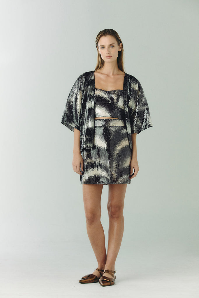 Inspired by Colombia’s magnificent tropical landscapes, Maria Fernanda Valencia built Juan de Dios to not only share that beauty, but give back to the land and its people. Engaging with local artisans, the brand’s consciously crafted swimwear and accessories arrive in unique collections that both flatter and feel amazing. Boasting a dazzling patterned Sequins, the Baracoa Sequins Crop Top in Black boasts an artistic, engaging brushstroke print. We love it as part of an evening look.
