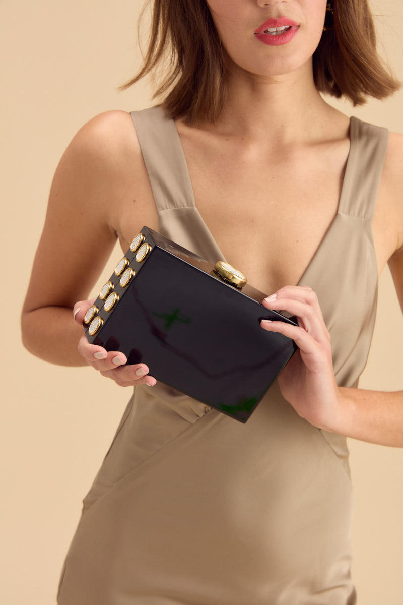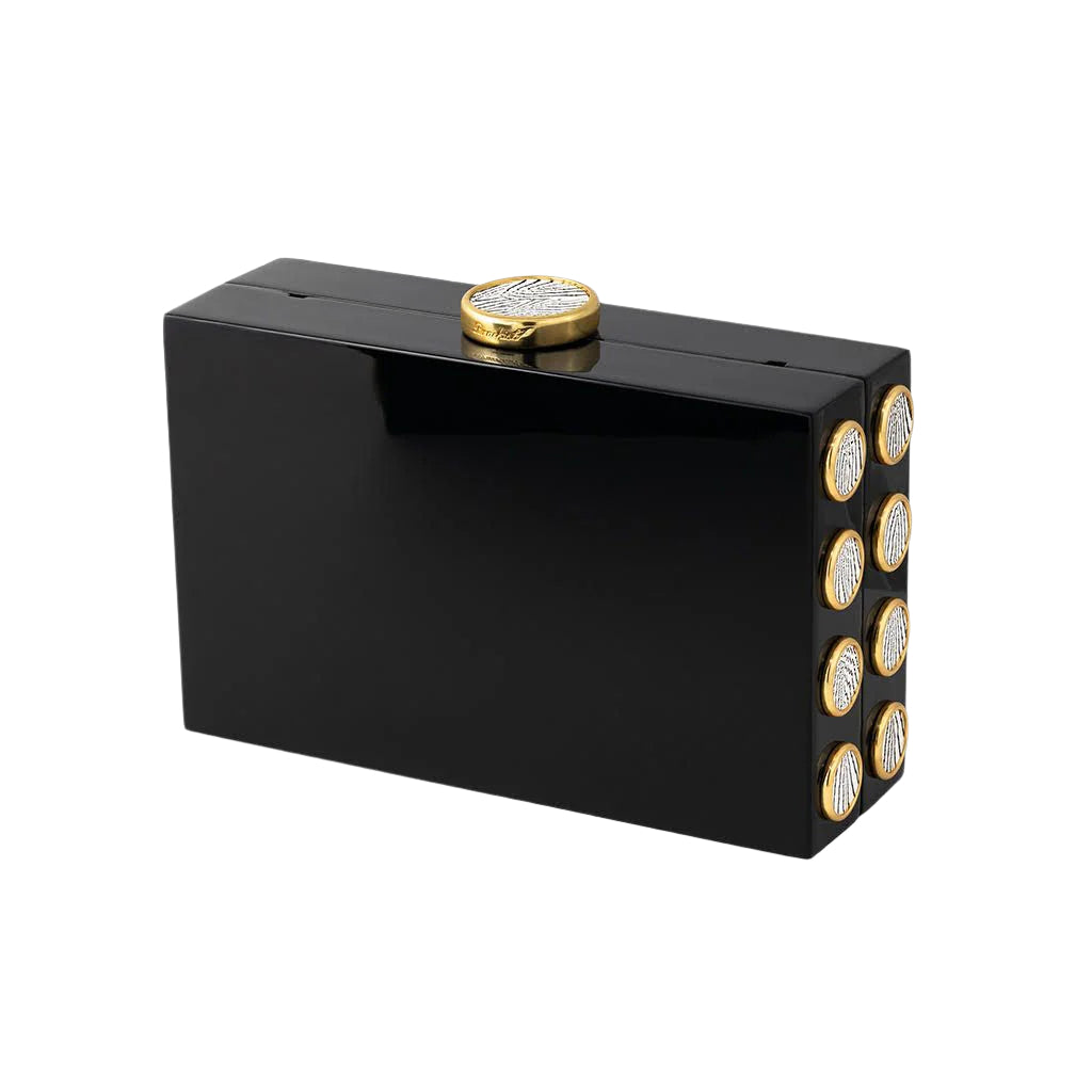 Brackish began with one feather bow tie designed by Ben Ross and gifted to his groomsman, Jeff Plotner. Since its inception, the brand has blossomed into full line of men’s and women’s accessories designed and handcrafted in Charleston, South Carolina with each piece focused on honoring the beauty found in nature. Inspired by the dynamic energy of the Basel Art Festival in Miami, the Basel Clutch in Black is a bold fusion of modern design and natural elegance. Featuring a sleek black acrylic shell and pheasant feathers that frame the clutch with smaller side bezels and a striking large bezel at the opening, this piece makes a statement like no other. The clutch (included with a gold chain for extra versatility) is lined with luxurious lambskin leather, adding an extra layer of sophistication to its already unique design. Whether you’re attending an art show or an evening event, this clutch effortlessly combines craftsmanship with contemporary style.