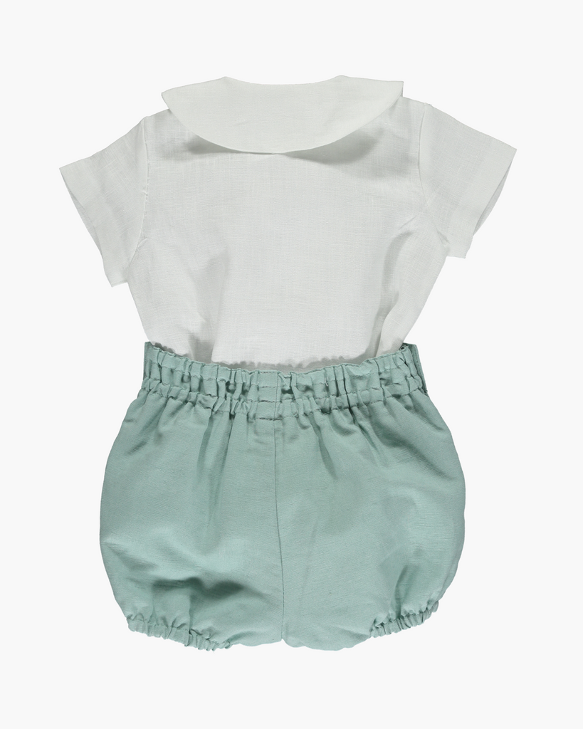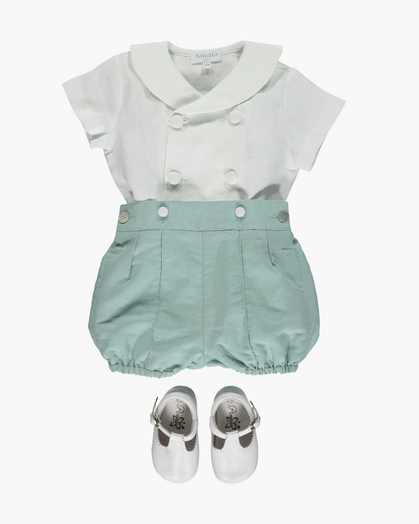 The Basil Baby Set in Green Linen is an elegant, timeless outfit designed for special occasions. Crafted from 100% linen, it features an off-white double-breasted shirt with short sleeves, a classic Peter Pan collar, and a back button fastening. The coordinating green linen bloomers have elasticated hems for comfort and ease. Ideal for weddings, christenings, or family celebrations, this set combines refined craftsmanship with understated charm.
