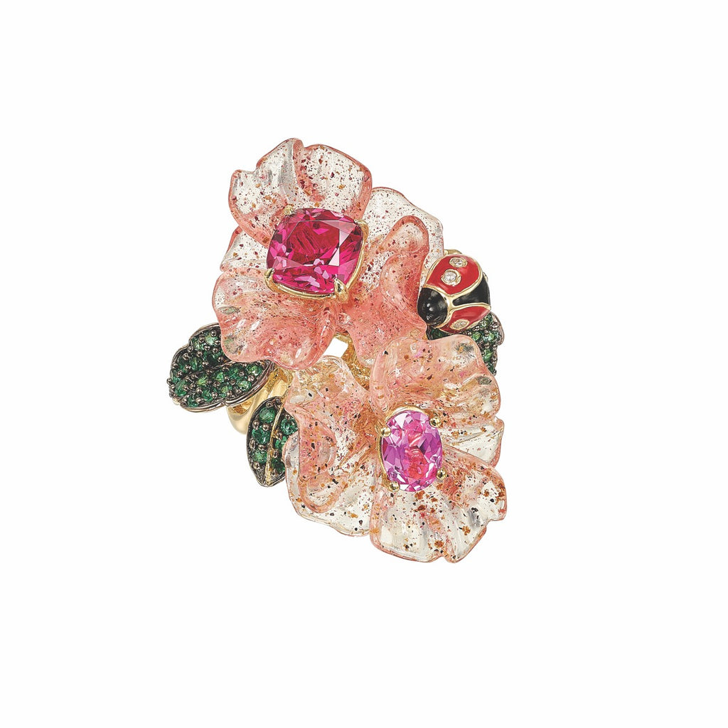Metals: 18K yellow gold vermeil. Synthesized gemstones: Beetroot and dragonfruit Fruit Gems™ petunia flowers; one 2-carat cushion-cut ruby; one 0.9-carat oval-cut pink sapphire. Simulated gemstones: 42 emeralds totaling 0.5 carats, 4 white diamonds totaling 0.04 carats. Hand-painted enamel. Handcrafted in the United Kingdom.