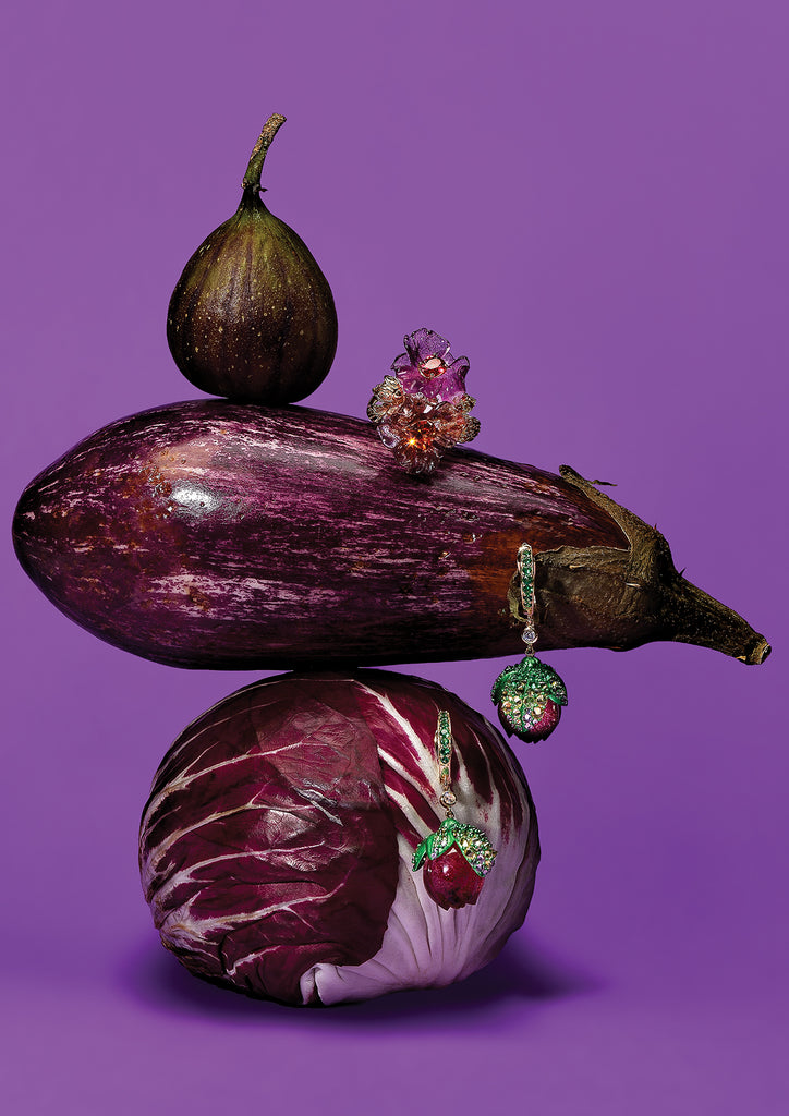 London-based Anabela Chan’s background in architecture and luxury fashion led to the first fine jewelry line to champion laboratory-grown gemstones. Today, its artisanal craftsmanship and sustainable innovations have found a place in the collections of royals, Rihanna, Taylor Swift, and sophisticated women worldwide. The Beetroot Lotus Earrings embody Chan’s “From Waste to Wonder” ethos—uniting traditional craftsmanship with bio-innovation. Handcrafted in 18K yellow gold vermeil with 14K gold posts, these earrings feature hand-carved Beetroot Fruit Gems™ derived from natural pigments and are intricately set with laboratory-grown emeralds, canary and pink diamonds, and simulated white diamonds.