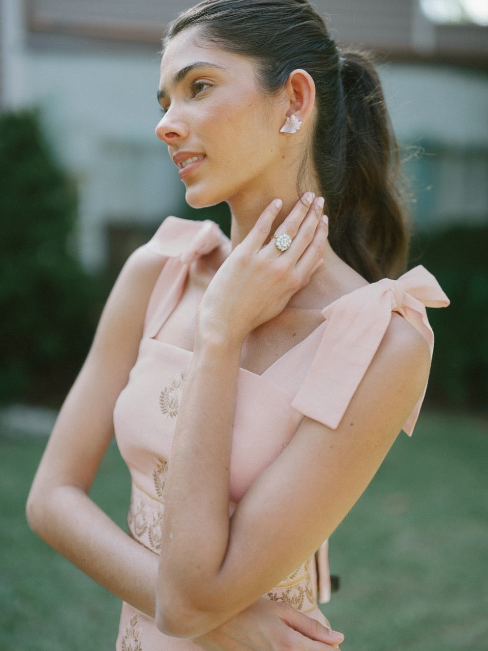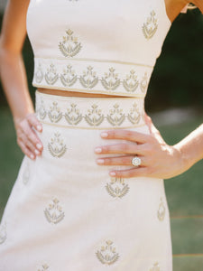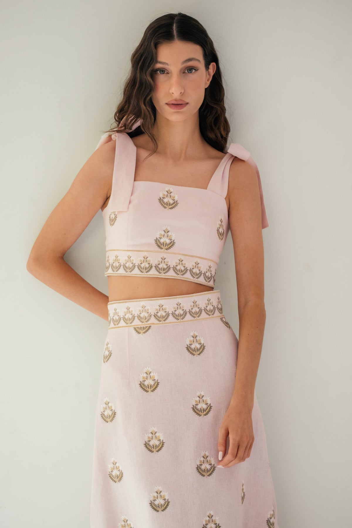 The brainchild of dynamic Iranian mother-daughter duo, Roshanak Varasteh and Leily Amirsardary Ahmed, RosewaterHouse is more than a fashion label; it is a testament to heritage, artisanal craftsmanship, and timeless design. Drawing inspiration from their cherished family heirlooms, Roshanak and Leily pay homage to the rich cultural tapestry of the Middle East, working exclusively with local artisans who breathe new life into age-old techniques, crafting exquisite, limited-edition garments that transcend age, style, and trends. These pieces are sure to become some of your most treasured. The stunning Begum Set in Pink & White is a soft statement-maker, ideal for everything from bridal showers and garden parties to lunch with the girls. The top features adjustable bow straps along the back, offering an impeccable fit.