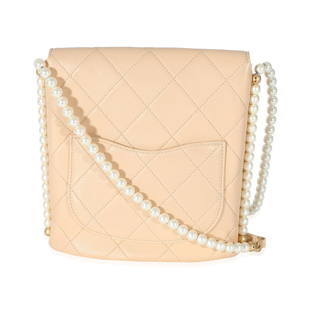 Pre-owned Chanel Small Pearl Chain Hobo in beige quilted calfskin leather with gold-tone hardware, circa 2019. Minor signs of wear. Light marks along base. Faint discoloration along interior. Features slouchy hobo silhouette, magnetic top closure, and pearl-accented chain shoulder strap. Includes original box, dustbag, receipt, care booklet, and authenticity card. Made in Italy.