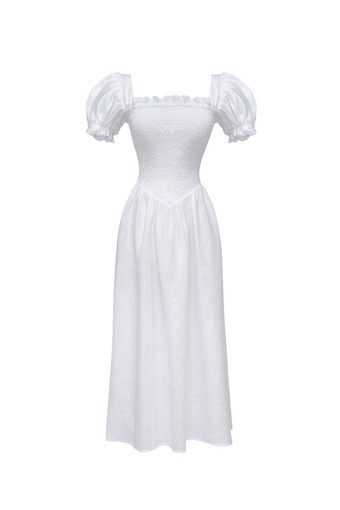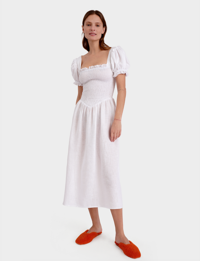 The stylish Belle Dress is comfort chic at its finest. This linen dress features a stretch bodice that provides gentle support and shape. The lantern sleeves contrast with the structured neckline that can be worn on or off the shoulders.