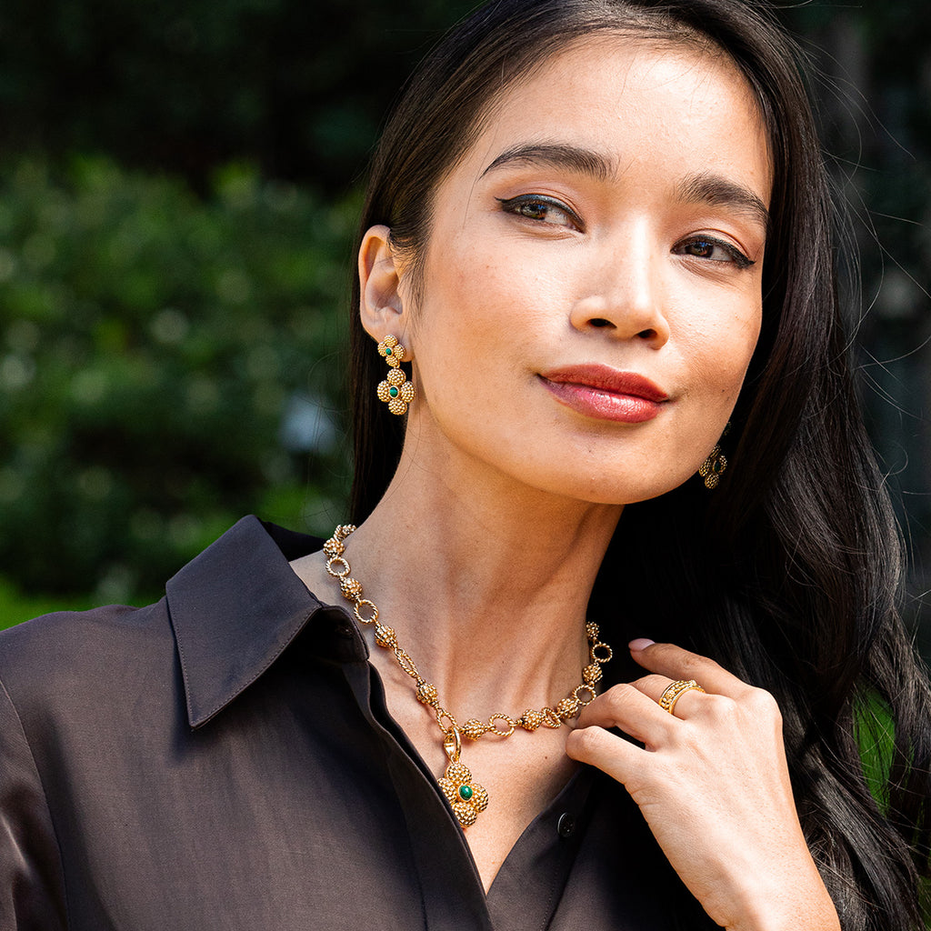 Half-Parisian, half-Texan, Capucine De Wulf’s unique upbringing was the inspiration for her namesake jewelry line. Her accessories combine French romance with an American sensibility. The Berry Clover Convertible Duo Earrings in Malachite feature the brand’s signature golden berries arranged in four-leaf clovers, symbolizing luck and love. With radiant green malachite gemstone centers, this versatile pair easily transforms from drop earrings to simple studs—two stunning looks in one gilded design.