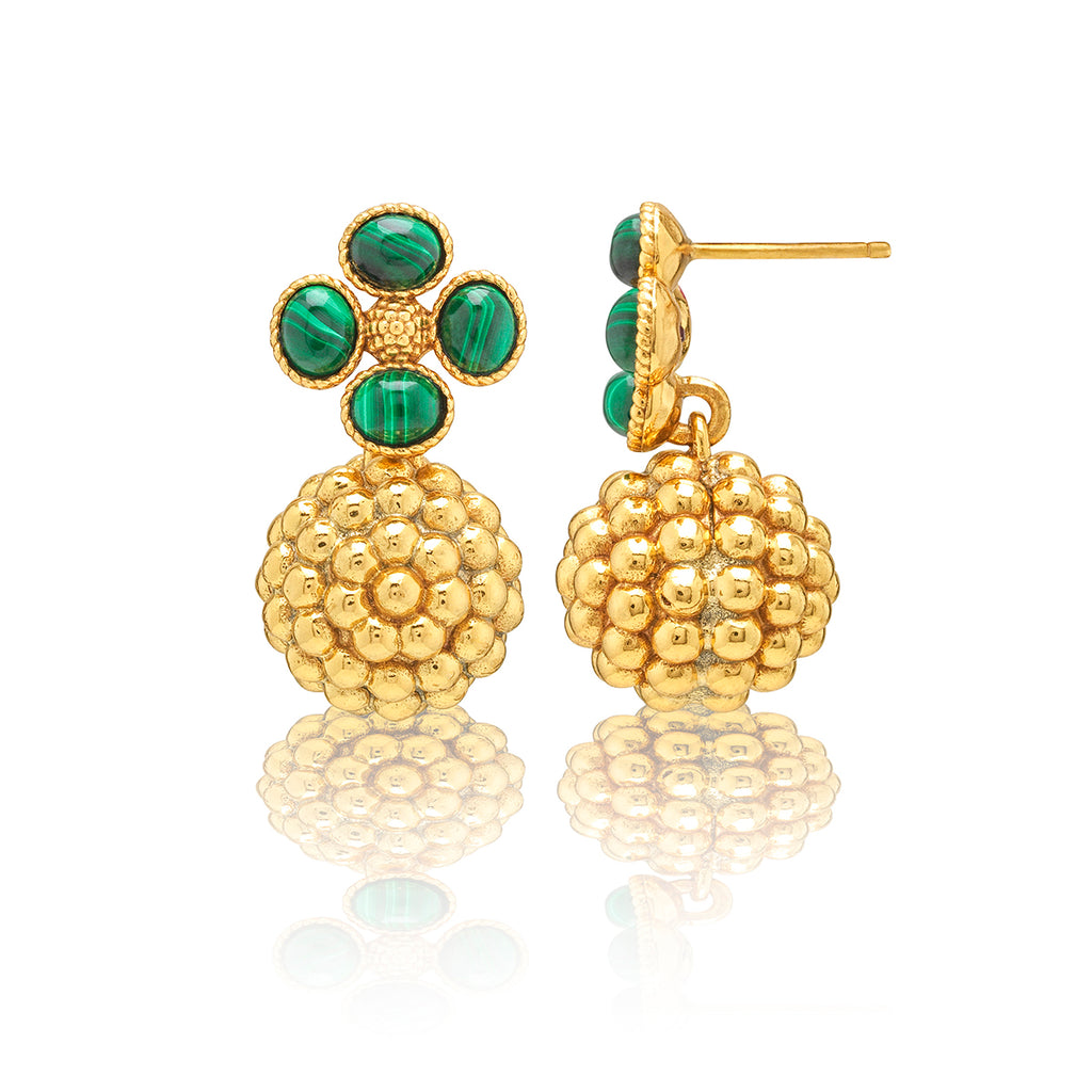 Malachite, 18K gold over brass with anti-tarnish coating. Lead-free. Nickel-free.