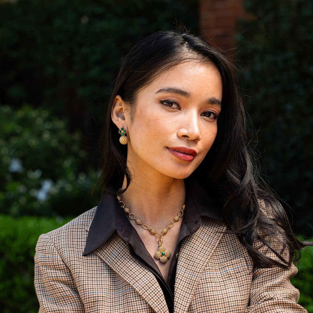 Half-Parisian, half-Texan, Capucine De Wulf’s unique upbringing was the inspiration for her namesake jewelry line. Her accessories combine French romance with an American sensibility. The Berry Clover Drop Earrings in Malachite feature radiant green malachite clovers adorned with golden berries, symbolizing luck and natural beauty. Elegant yet easy to wear, they add a refined touch to everything from denim to eveningwear.