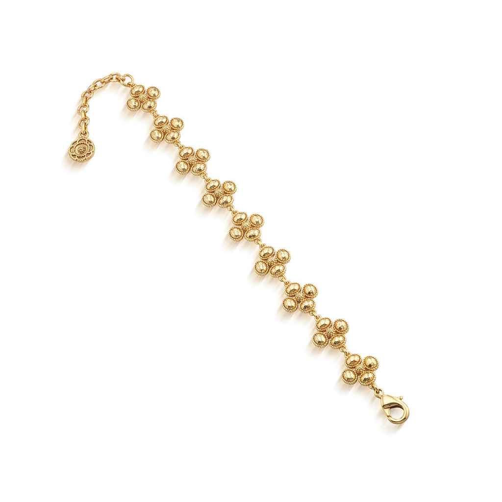 Half-Parisian, half-Texan, Capucine De Wulf’s unique upbringing was the inspiration for her namesake jewelry line. Her accessories combine French romance with an American sensibility. The Berry Clover Linear Bracelet in Gold links gleaming golden clovers in a graceful row, capturing the charm of a field of lucky blooms. Elegant on its own or layered in a bracelet stack, it adds a glint of refined serendipity to any look.