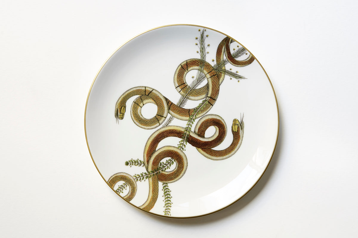 Illustrated by a different snake design—meant to symbolize transformation and the continual renewal of life—each of Costanza Paravicini's striking Serpentine Dinner Plates is handcrafted and hand-decorated by artisans at the family's ceramic workshop in Milan. With a glossy finish and gilded edges, this set of 6 will add sophistication to any modern place setting and is sure to be a conversation starter when you gather around the table.