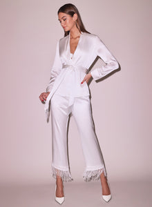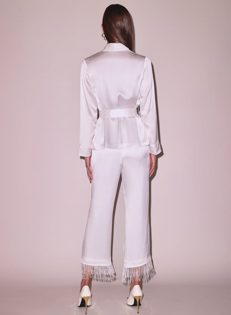 Inspired by Charles Baudelaire's masterful collection of poetry entitled “Les Fleurs du Mal,” Jennifer Zuccarini founded Fleur du Mal with the belief that wearing beautiful lingerie should be an everyday affair. Tastefully provocative, the luxury brand has amassed a cult following of devotees who adore the sultry and empowering pieces. The Bianca Fringe Silk Pant, cut from luxe silk charmeuse with hand-beaded swinging fringe embellishment, features flat elastic waistband with ruched back for comfort and fit.