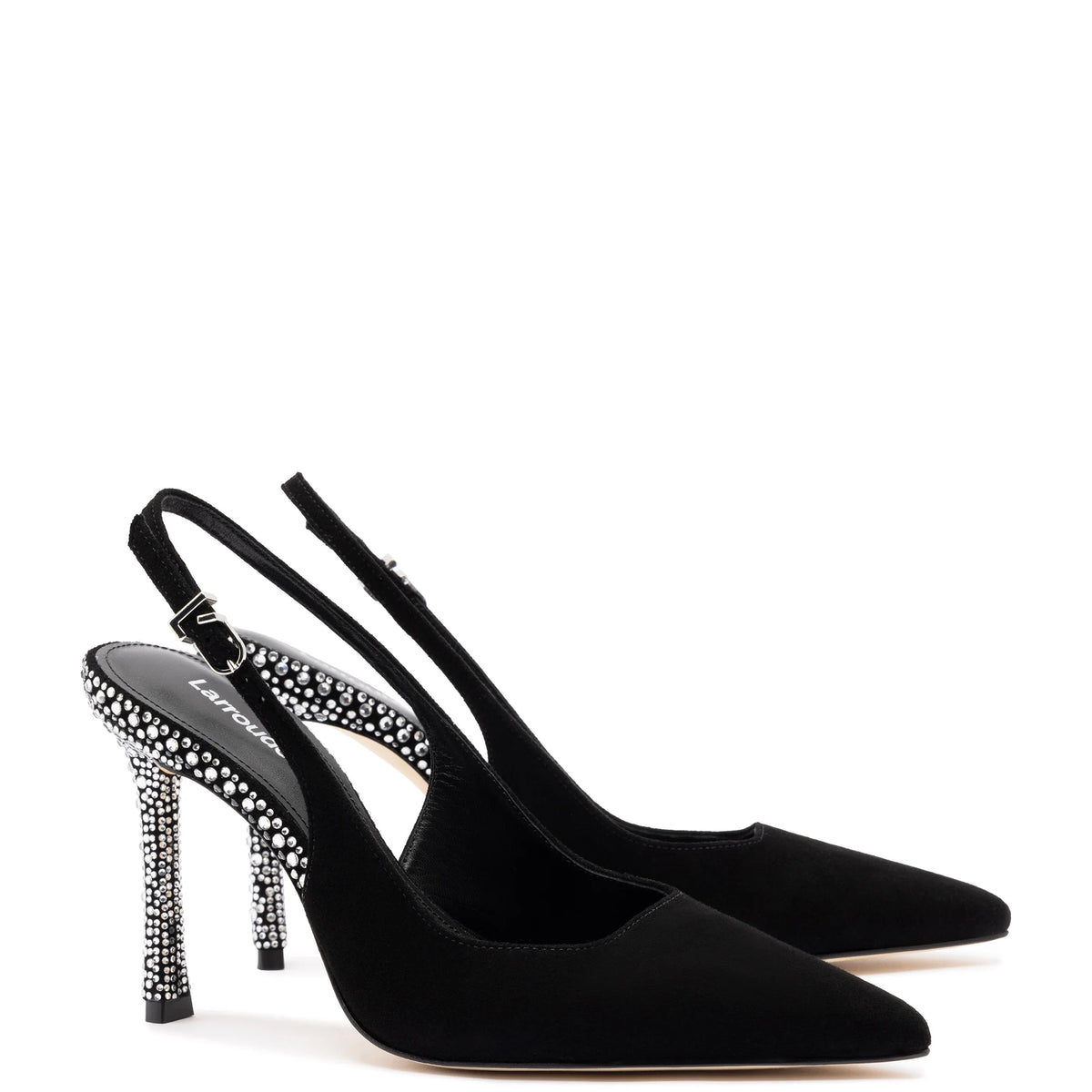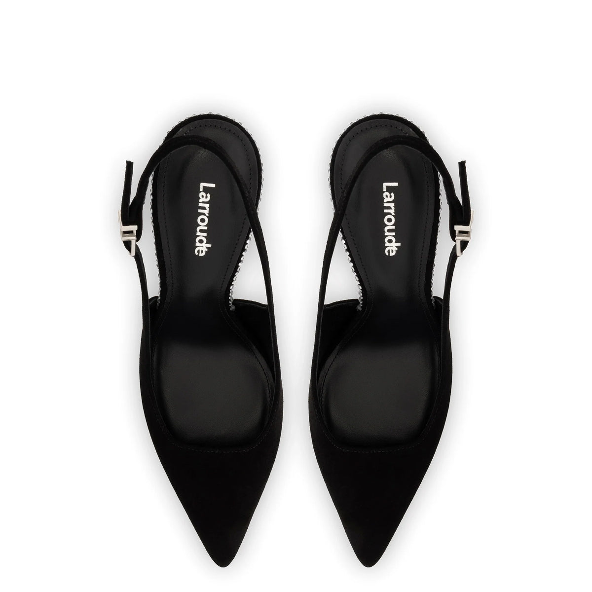 Bold colors, playful patterns, and chic silhouettes are hallmarks of Larroudé, a shoe brand born of the pandemic from industry veterans and husband-and-wife team Marina and Ricardo Larroudé. Manufactured in Brazil, Larroudé shoes are designed with the consumer and community in mind, never compromising on style, fit, and quality. Timeless yet chic and boasting a super sleek silhouette, the sexy slingback Kaitlan Crystal Pump In Black Suede are the classic every woman’s closet needs.