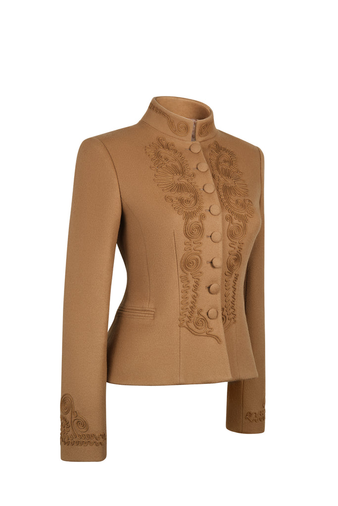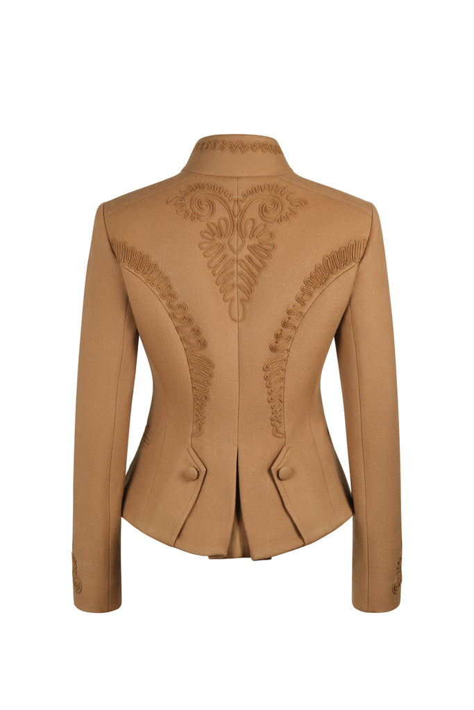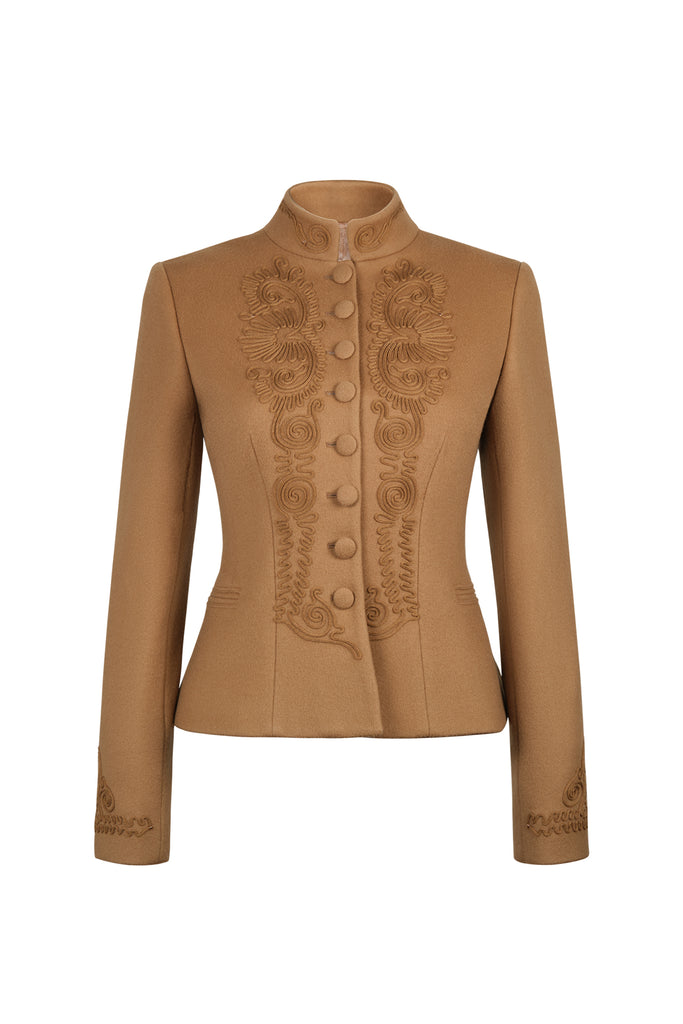 Looking to their Peruvian and Bavarian heritage, lifelong friends Sabrina Burda and Noelle Pallais were inspired to create Sanoë by rummaging through their grandmothers’ closets. With an eye on slow fashion and the other on contemporary style, the NYC-based brand designs their jackets—based on alpine peasant “trachen jacken”—to stand the test of time in small batches using ethically sourced fabrics. Crafted in a wool-cashmere blend, the Blaire Brun Jacket in Beige is the embodiment of fireside warmth and amber sunsets—tailored for strolls and gatherings alike.