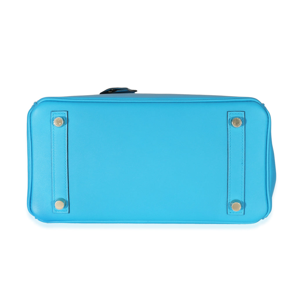 Pre-owned Hermès Birkin 25 in Bleu Zanzibar Swift leather with gold hardware, circa 2016. Light signs of wear. Light discoloration along hardware. Minor indent along top flap closure. Features a trapeze silhouette with dual rolled top handles, turn-lock closure, and metal feet. Leather interior with zip and slip pockets. Includes original box, clochette, dustbag, lock, keys, raincoat, gift ribbon, care booklet, and felt protector. Made in France.