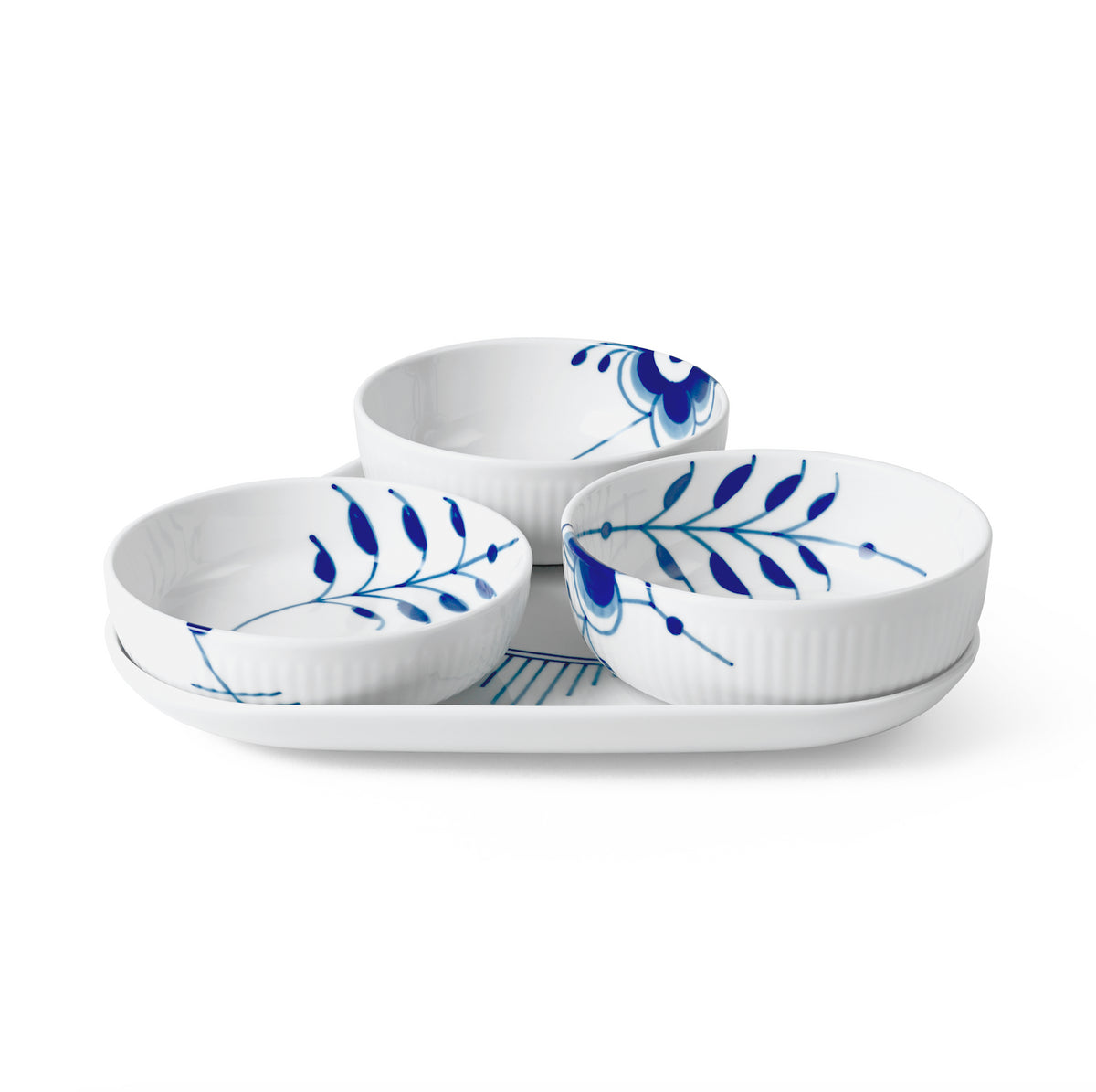 Founded under the reign of Danish Dowager Queen Juliane Marie in 1775, Royal Copenhagen is one of the oldest and most respected brands in the world. Crafted with superior materials and held to the highest standards, their fine porcelain is meant for everyday use. Refreshing and yet familiar, the Blue Fluted Mega series features selected details by Karen Kjældgård-Larsen, enlarged but still painted by hand, preserving the original and unique vivid blue effect. The Blue Fluted Mega Serving Set 4Pc ideally elegant for serving everything from nuts and other tiny snacks, to sauces and toppings at dessert time.