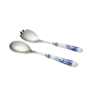 Set of 2 salad servers. Includes one fork and one spoon. Stainless steel with ceramic handles. Features Blue Italian design. Color: Blue and White.