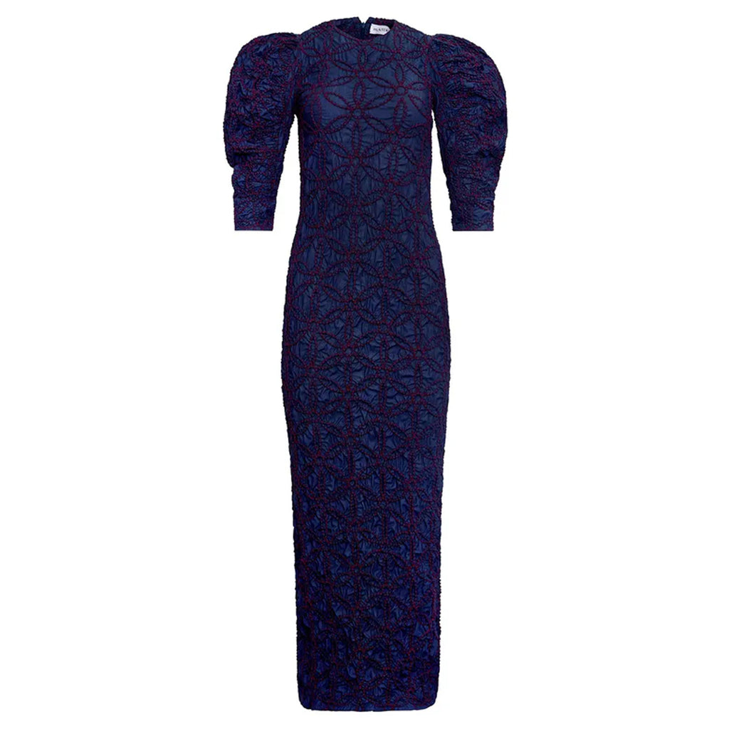 Hunter Bell strives to spark joy and inspiration with clothing that empowers women to embrace their personal style. The New York City–based brand is all about fashion-forward, fun looks, designed with detailed craftsmanship and exceptional wearability. The Blythe Dress in Navy is a striking new silhouette that blends sophistication with a modern edge. Crafted in Italian embossed cotton, this midi-length bodycon dress hugs in all the right places while offering comfortable stretch. A clean crew neckline keeps the shape timeless, while oversized ruched long sleeves bring unexpected drama. Finished with a back kick pleat for ease of movement, Blythe is designed to make an impression this season.