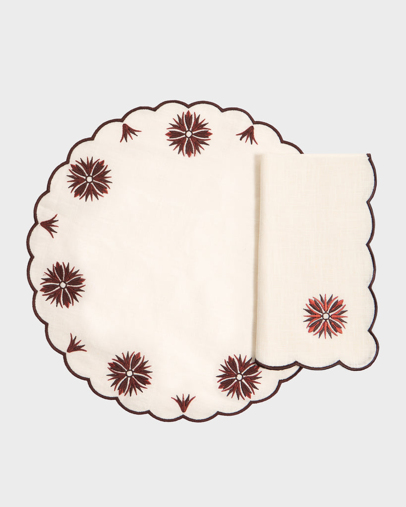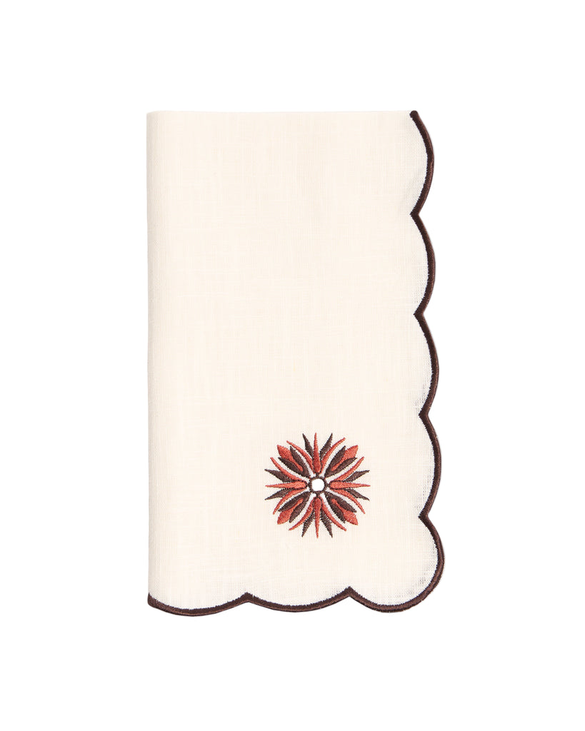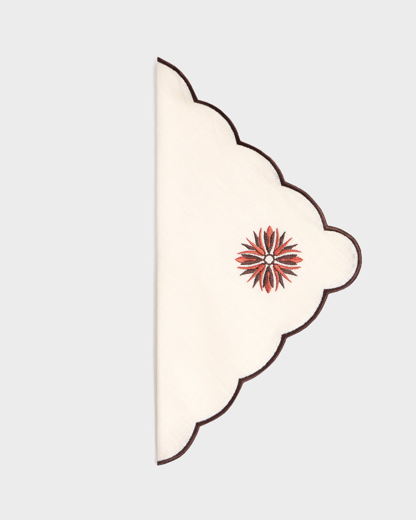 Inspired by the pages of Cabana—a magazine for a new generation of globetrotters—Casa Cabana’s homewares both explore and expand the worlds we share with our interiors. The Botanica Embroidered Napkin Terracotta in White/Burgundy is crafted from a soft linen blend and finished with intricate embroidery along scalloped edges. A delicate floral medallion motif blooms in warm, earthy tones, bringing natural charm and artisanal elegance to any table setting.
