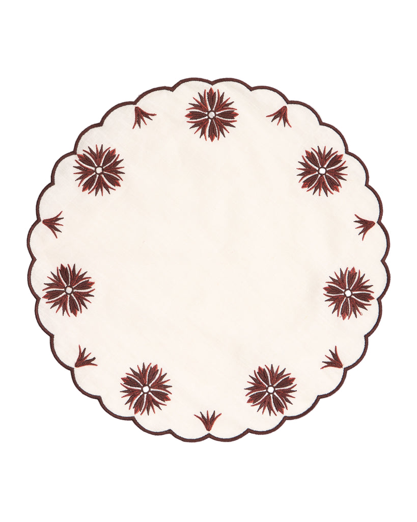 Inspired by the pages of Cabana—a magazine for a new generation of globetrotters—Casa Cabana’s homewares both explore and expand the worlds we share with our interiors. The Botanica Embroidered Round Placemat Terracotta in White/Burgundy is crafted from a soft linen blend and finished with intricate embroidery along scalloped edges. A delicate floral medallion motif blooms in warm, earthy tones, bringing natural charm and artisanal elegance to any table setting.
