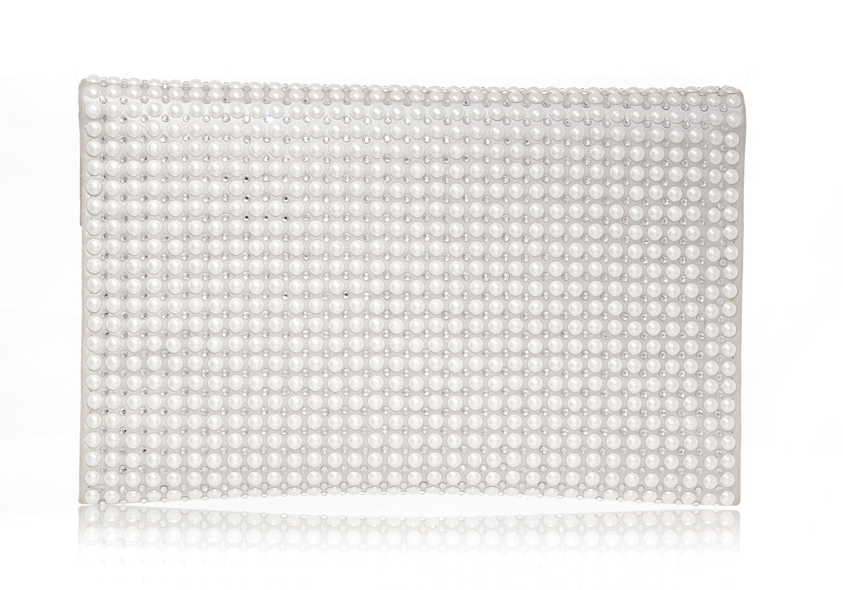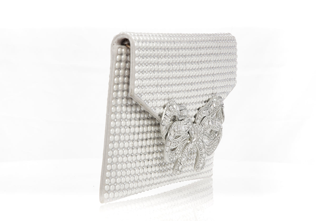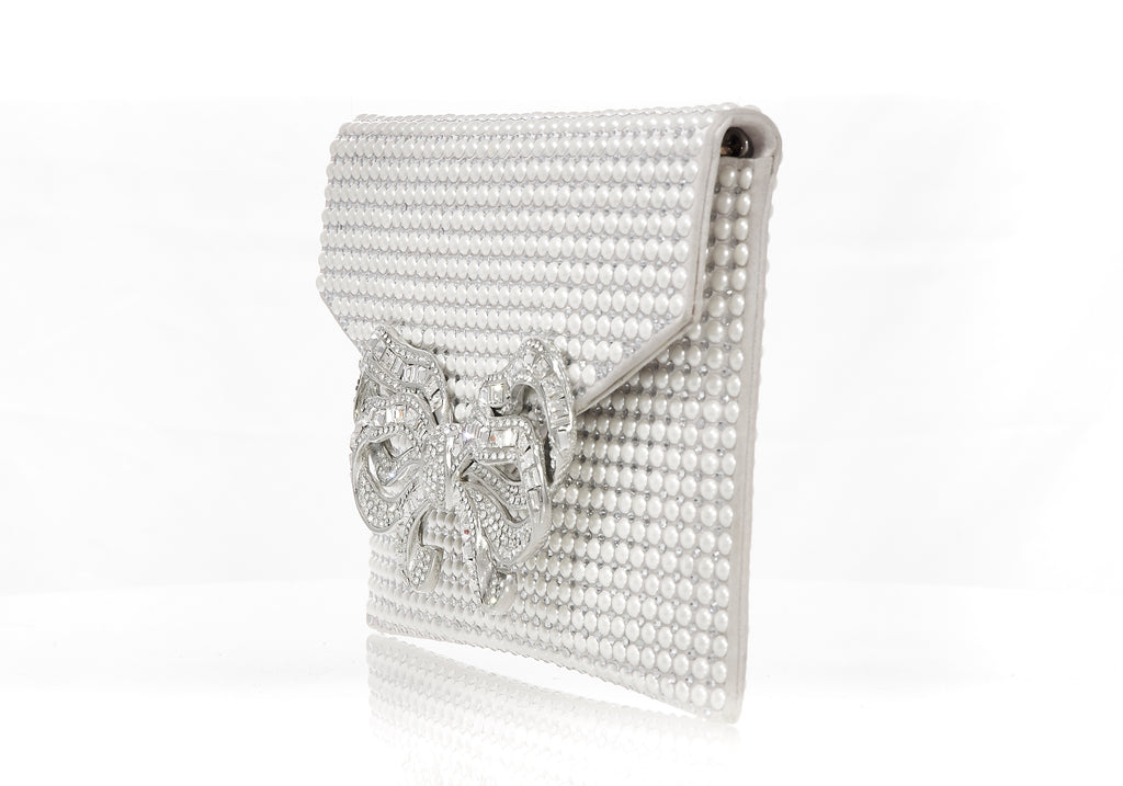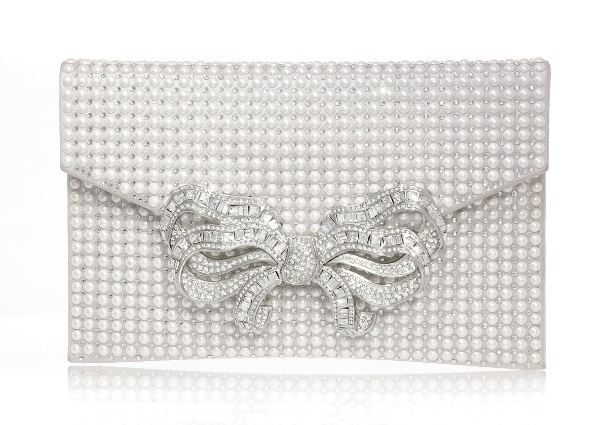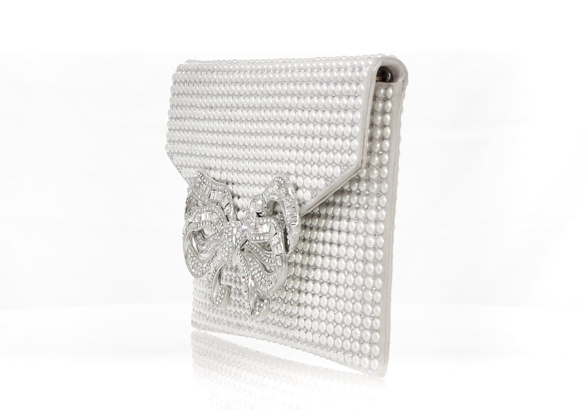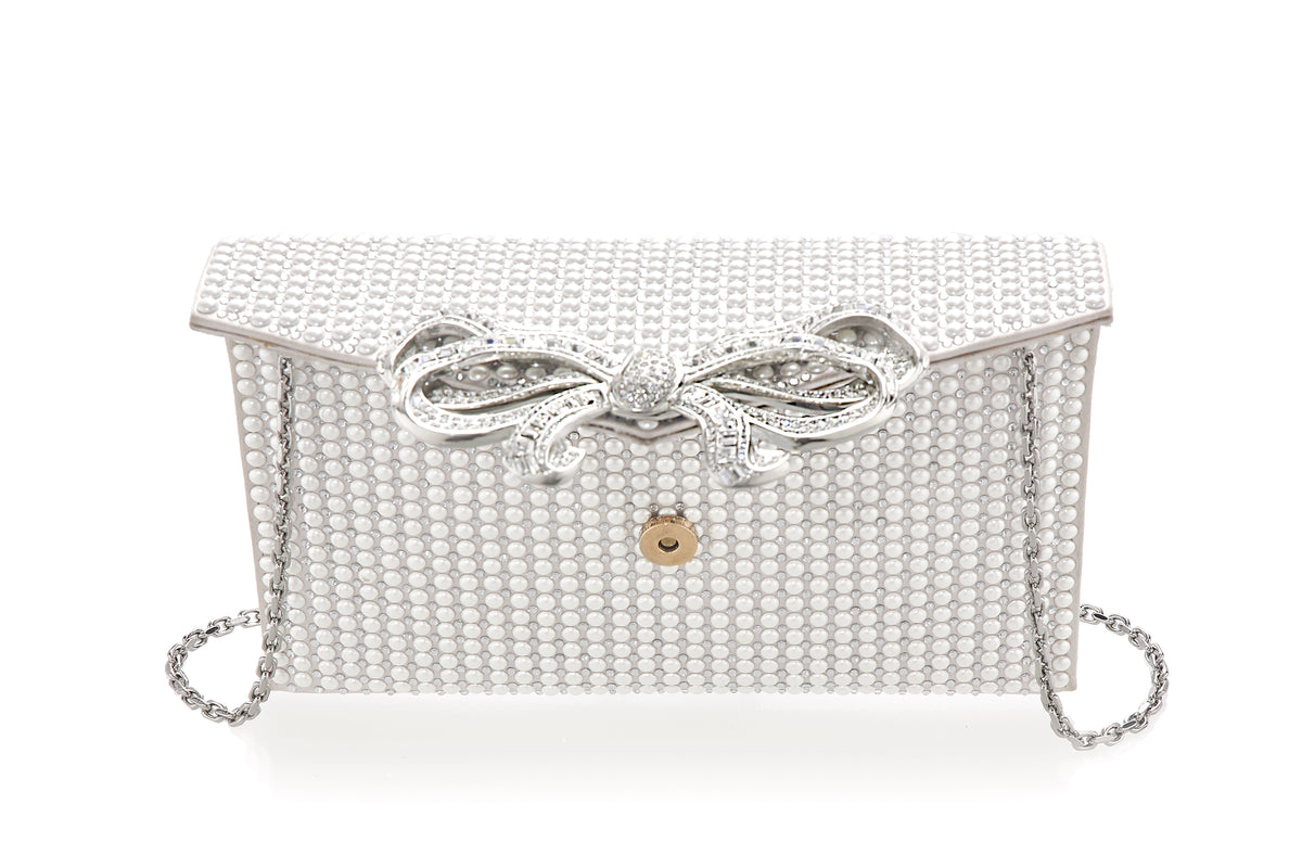 Judith Leiber is an iconic American accessories brand known for its meticulous attention to detail and flawless hand craftsmanship. Counting First Ladies, including Jackie Kennedy, and A-listers from Beyoncé to Jennifer Lawrence among its many acolytes, the label impresses with its signature take on luxury. Crafted in rich Italian satin, the Bow Envelope Clutch in Pearl is covered in both pearlized stones and handset crystal for just the right amount of glitz. Designed in studio, using using jewelry-making techniques, a stunning custom bow brooch finishes this piece with baguette-shaped handset crystals.