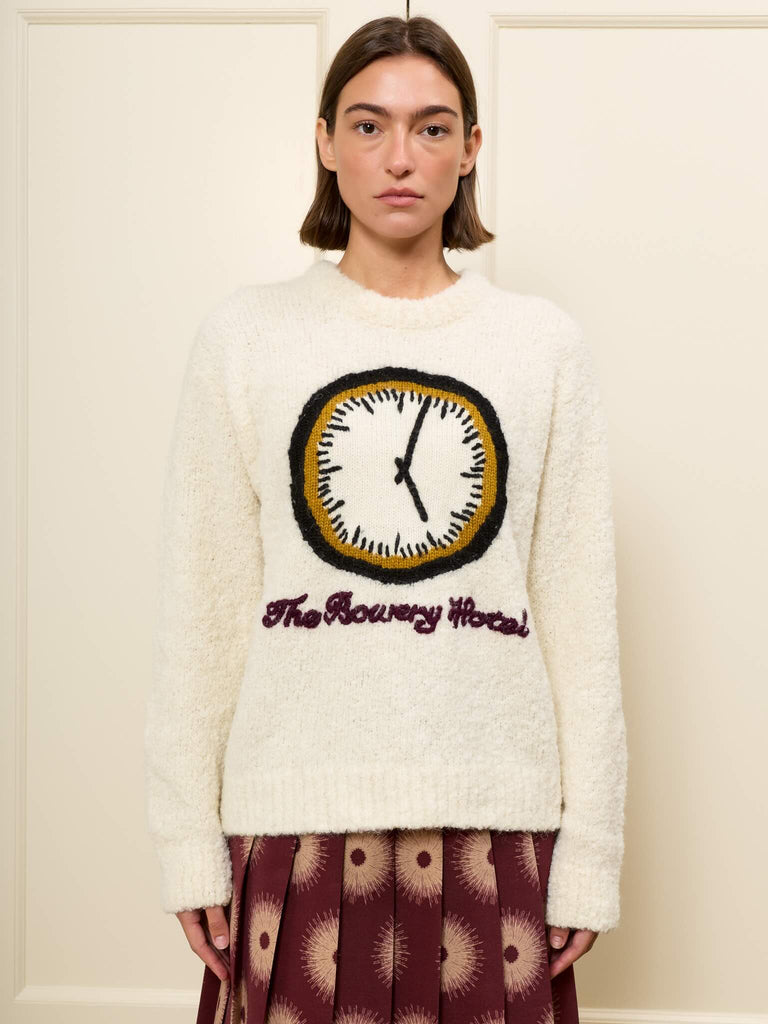 Lingua Franca is a line of sustainably-sourced, fair trade luxury ready-to-wear and cashmere pieces, all hand-stitched by women in New York City. The Bowery Clock Sweater in Cream is a playful nod to the iconic train station clock that hangs above the entrance of The Bowery Hotel—an emblem of timeless New York charm. Crafted from an ultra-soft superfine alpaca wool blend, it features an intarsia-knit clock motif and an effortlessly slouchy, oversized fit. Cozy yet elevated, this sweater is designed to be a forever favorite that only gets better with time.