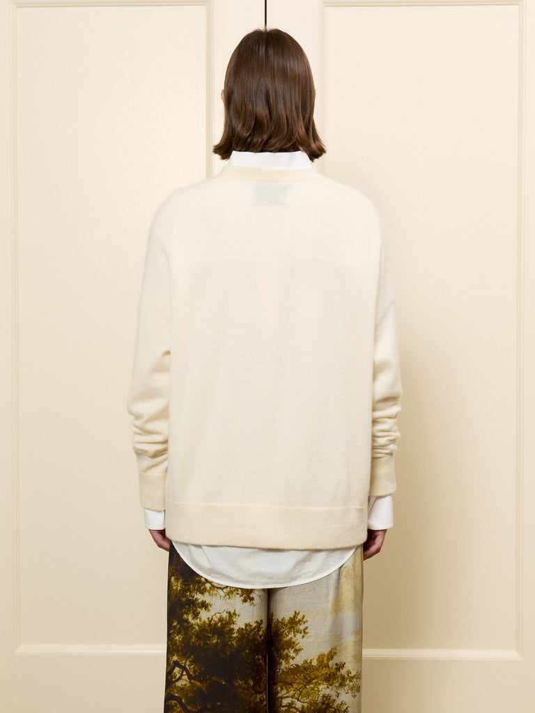 100% cashmere. Intarsia-knit The Bowery Hotel logo. Crew neckline. Oversized, boxy silhouette. Relaxed drape.