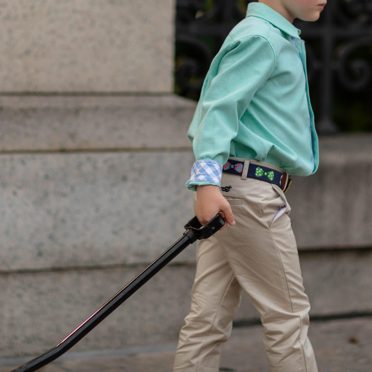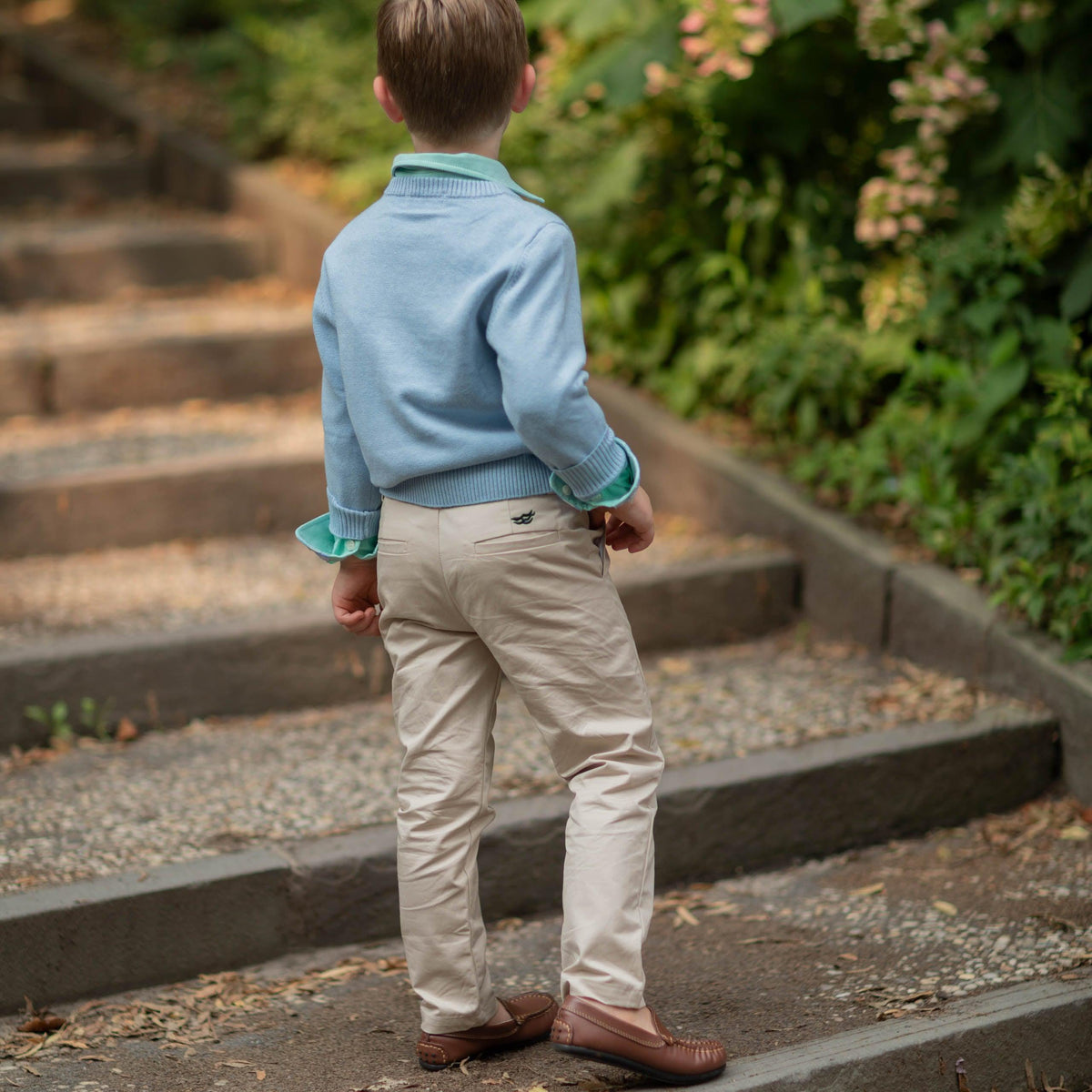 A celebration of the spirit of boyhood, the updated classics from Henry Duvall are curious, imaginative, and sweet. Full of character and playful details, these are easy to care for clothes that boys will love. Fun to cuff and fully lined, the Bradford Trousers in King Way Khaki Chino are the ideal fall and winter staple for your dapper little boys. They can be paired and coordinated with so many options, making them the ultimate basic he needs in his closet. Pair them with our long sleeve polos for more casual days or our button downs for dressing up and he'll be the best dressed for every occasion.