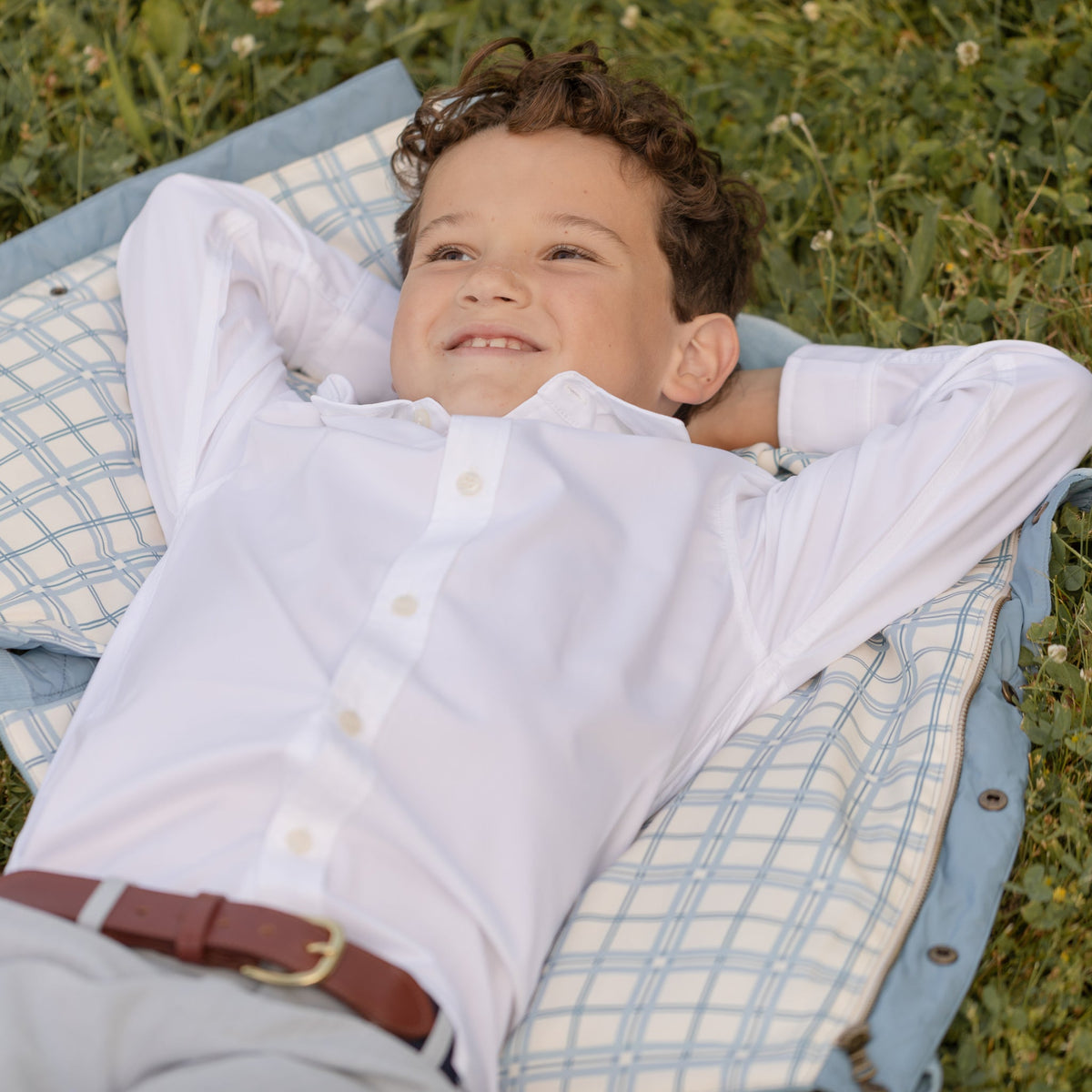 A celebration of the spirit of childhood, the updated classics from Henry Duvall are curious, imaginative, and sweet. Full of character and playful details, these are easy to care for clothes that boys will love. The Bradley Barn Jacket in Bay Tree Blue is the ideal medium weight quilted coat to keep him warm on cool fall days and layer with sweaters in the winter. It is classic, preppy perfection and can be styled with all fall and winter looks.
