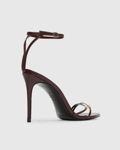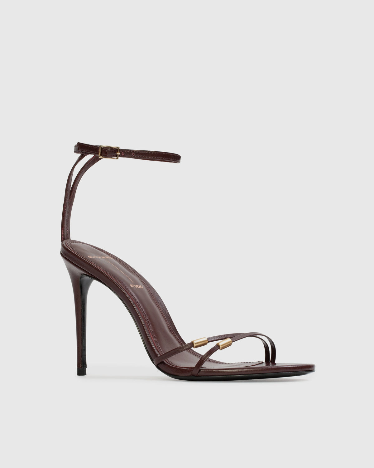 Founded by Kris Avakia in Montréal, Black Suede Studio fuses heritage, passion, and fine craftsmanship to form a line of forward-thinking, luxury footwear. The Britanny 100 in Bordeaux Leather is a round toe sandal, crafted in smooth goat leather and finished with brushed gold bean studs. Set on a high stiletto pin heel, this striking silhouette combines bold edge with refined elegance, making it a standout for evening wear or elevated occasions.