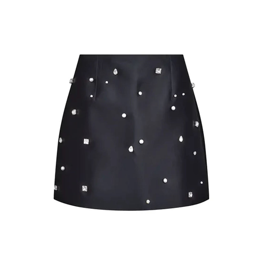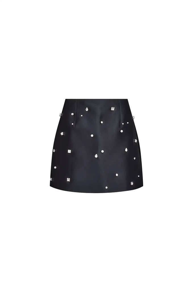 The Britt Mini Skirt in Onyx elevates the classic mini with refined detail and luminous texture. Crafted in sleek duchess satin and hand-embroidered with pearls and rhinestones that catch the light beautifully, it brings subtle glamour to every occasion. Pair it with the contrast Olivia Top for a bold color-block moment or with the Tini Time Turtleneck for a sparkly, party-ready look.