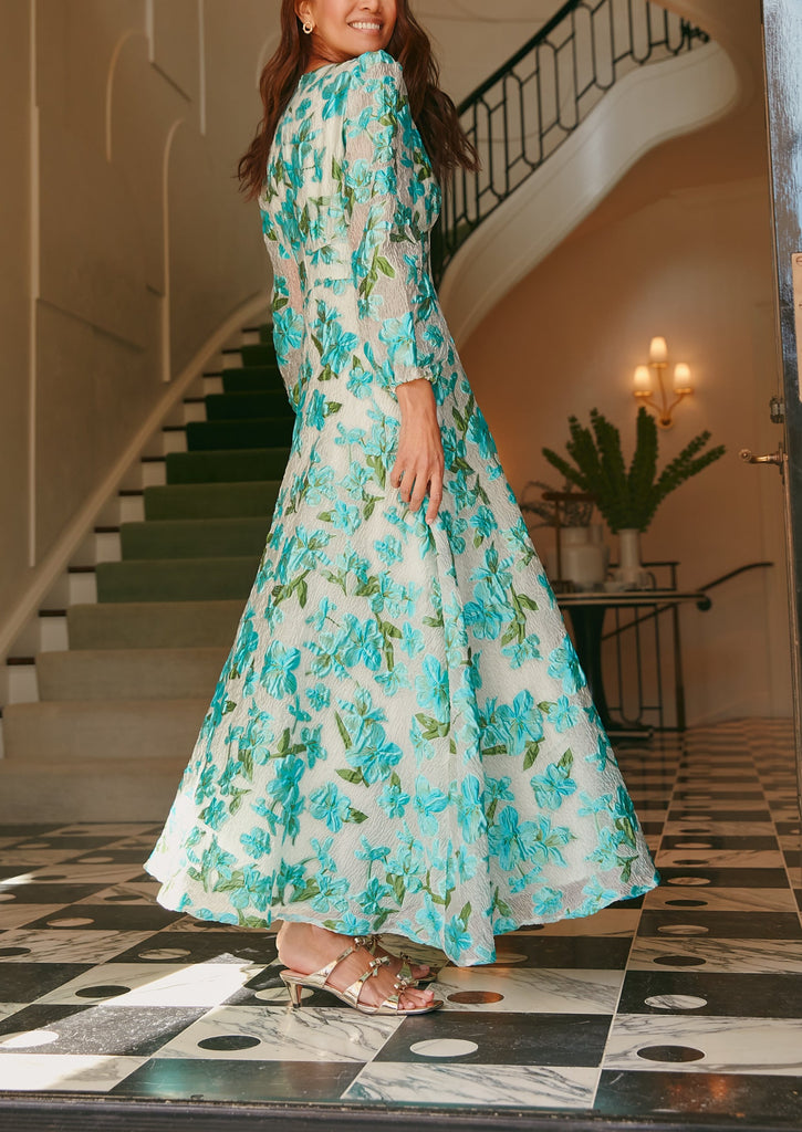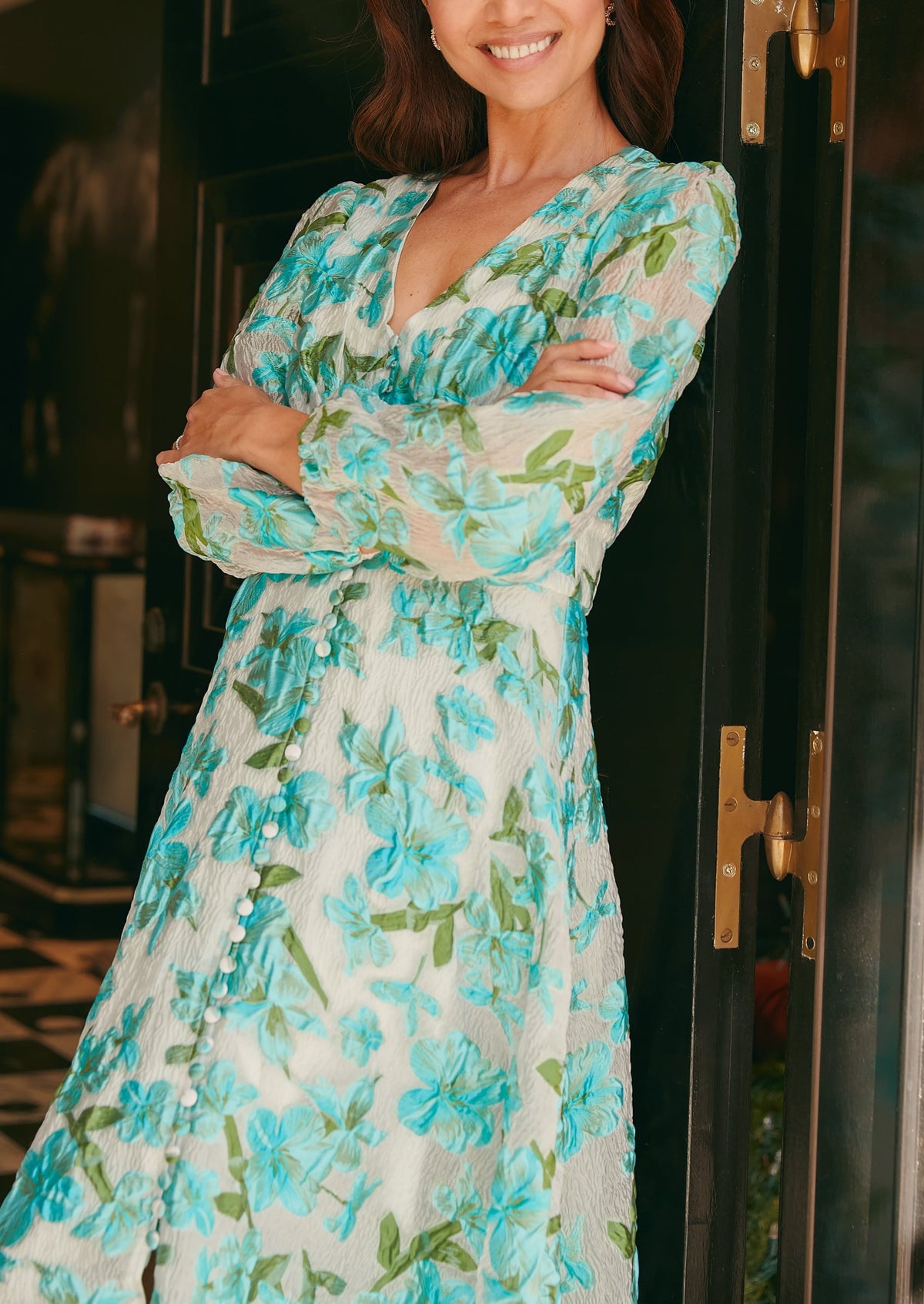 Timeless but playfully elegant, Abbey Glass is an approachable luxury womenswear brand based in Atlanta, Georgia. The Brooke Gown is tailored to perfection with semi-sheer soft organza in a tropical-inspired turquoise print. The dress features front-covered buttons, a deep V-neck, and sheer sleeves.