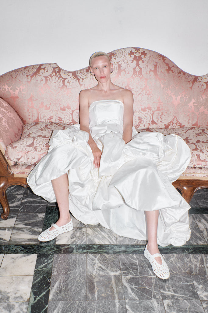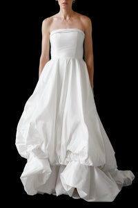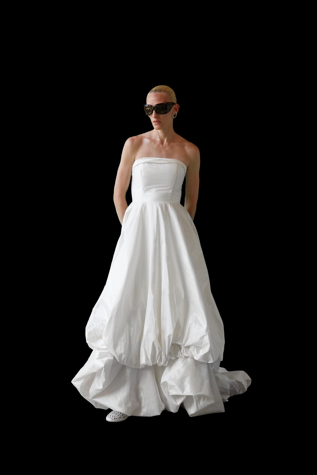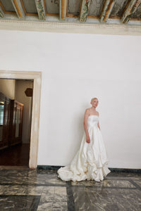 Handmade at its London atelier, The OWN Studio’s signature style combines pared-back, contemporary silhouettes with unexpected vintage details resulting in considered, minimal styles for the modern woman. The label brings a fresh and contemporary approach to wedding and evening wear. A unique silhouette with a dipped bubble hem crafted in signature silk taffeta, the Bubble Hem Gown | STYLE 040 is chic and romantic all at once. It has a folded pleat neckline and boning in the bodice for a supportive fit. The cinched high waist contrasts with the soft clouds of fabric in the skirt to create a beautifully feminine and cinched silhouette.