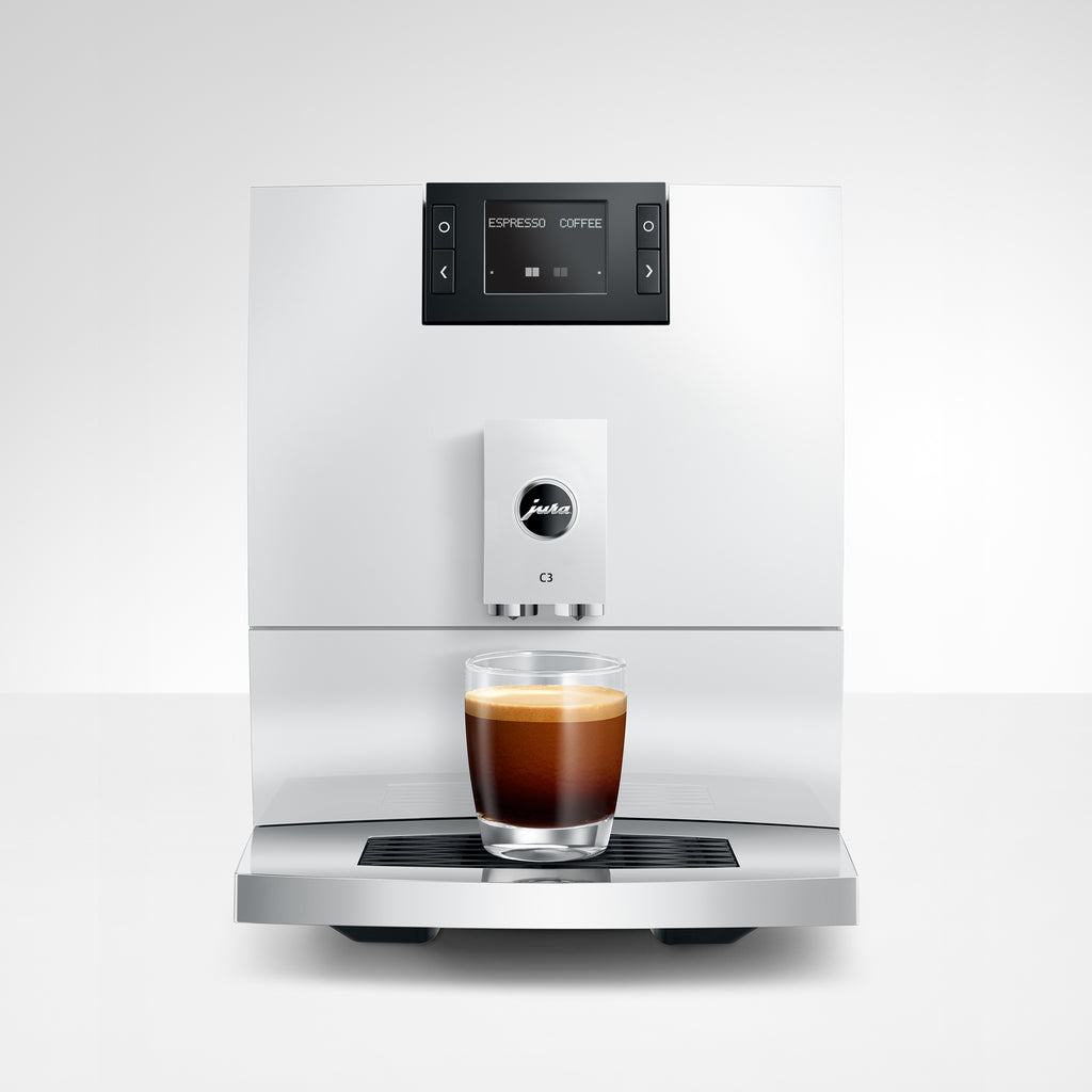 The C3 Fully Automatic Coffee Machine in Piano White delivers essential coffee classics with precision and ease, using freshly ground beans for optimal aroma and flavor. Designed for streamlined performance, it prepares four core specialties—espresso, double espresso, coffee, and double coffee—at the touch of a button. A Professional Aroma Grinder and Pulse Extraction Process (P.E.P.®) work together to ensure consistent extraction and rich flavor, while the intuitive control panel with text display makes operation simple. Compact and refined, its clean, wave-inspired design fits seamlessly into both modern kitchens and workspaces.