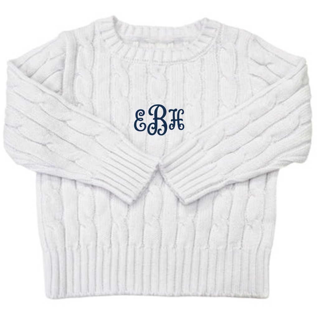 100% cotton. Classic cable-knit design. Crewneck style. Made in China.