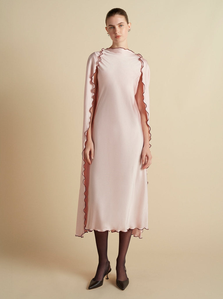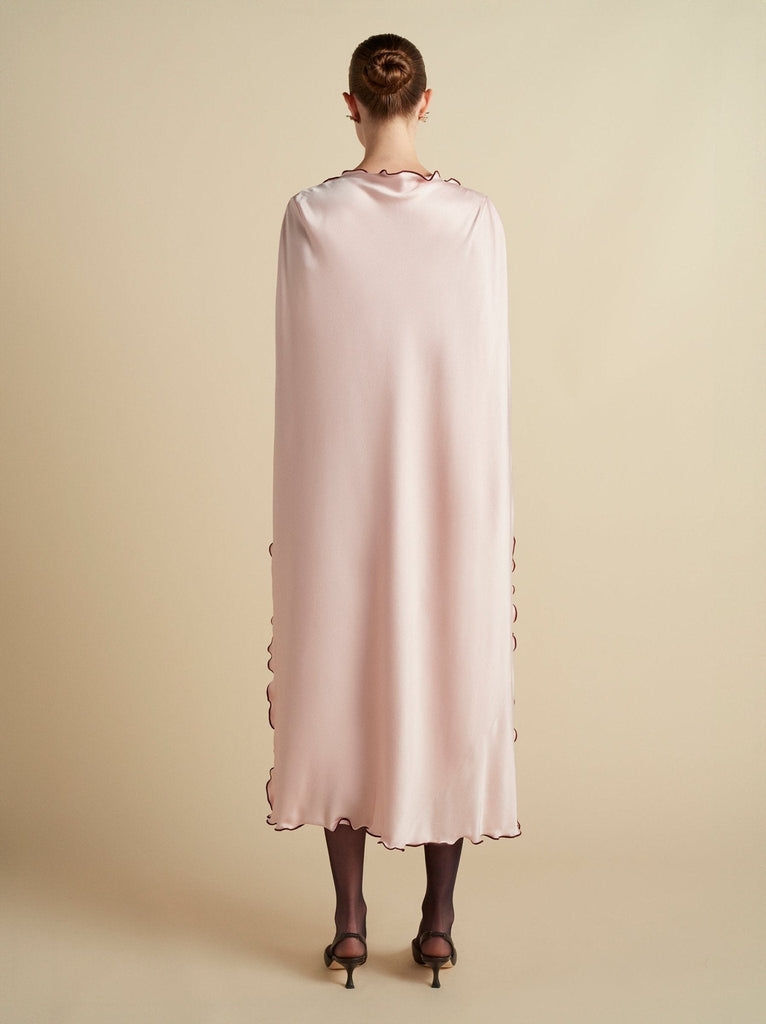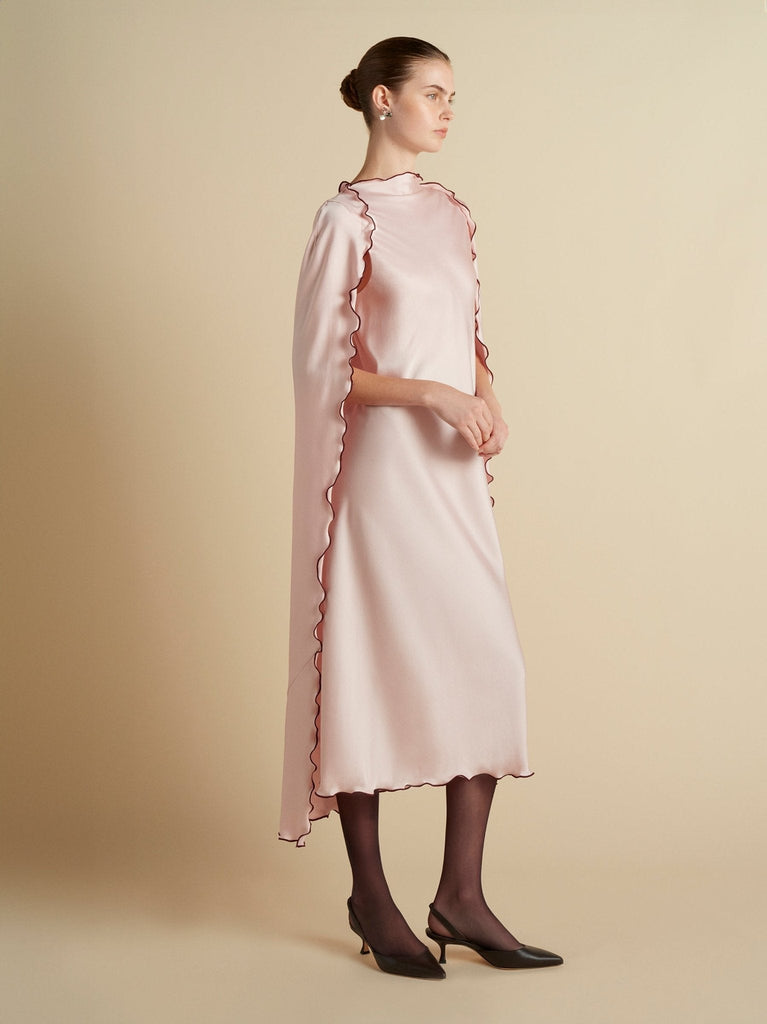 Founded in 2016 by sisters Marina and Francesca Moscone, the label gravitates toward a tactile approach, twisting and draping fabrics by hand to create a softly seductive design using custom jacquards, fil-coupés, and silk wools, all exclusively developed in Italy, rendered in precise shapes and tailoring. The Cady Cape Dress with Scalloped Edge in Camellia embodies this refined artistry, featuring a relaxed sheath silhouette that falls beneath a fluid cape overlay, finished with contrast garnet scalloped edging for a striking graphic detail.