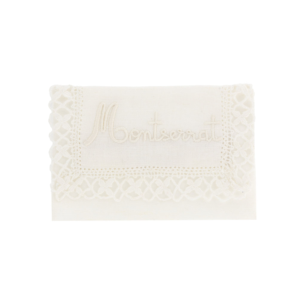 100% linen with handmade bobbin lace from Camariñas. Personalized with embroidered name in red. Limited-edition design. Handcrafted in Portugal.