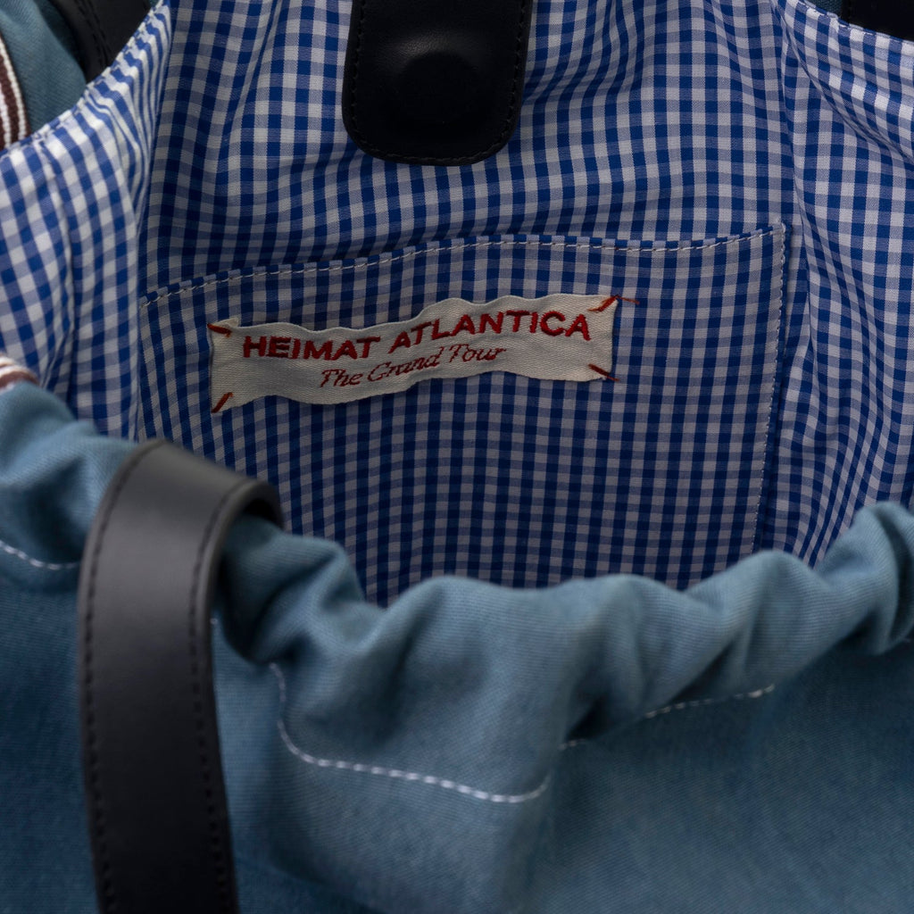 Denim with handmade linen lace label. Leather drawstring closure. Plaid interior. Multiple exterior pockets and one interior compartment. Handcrafted in Portugal.