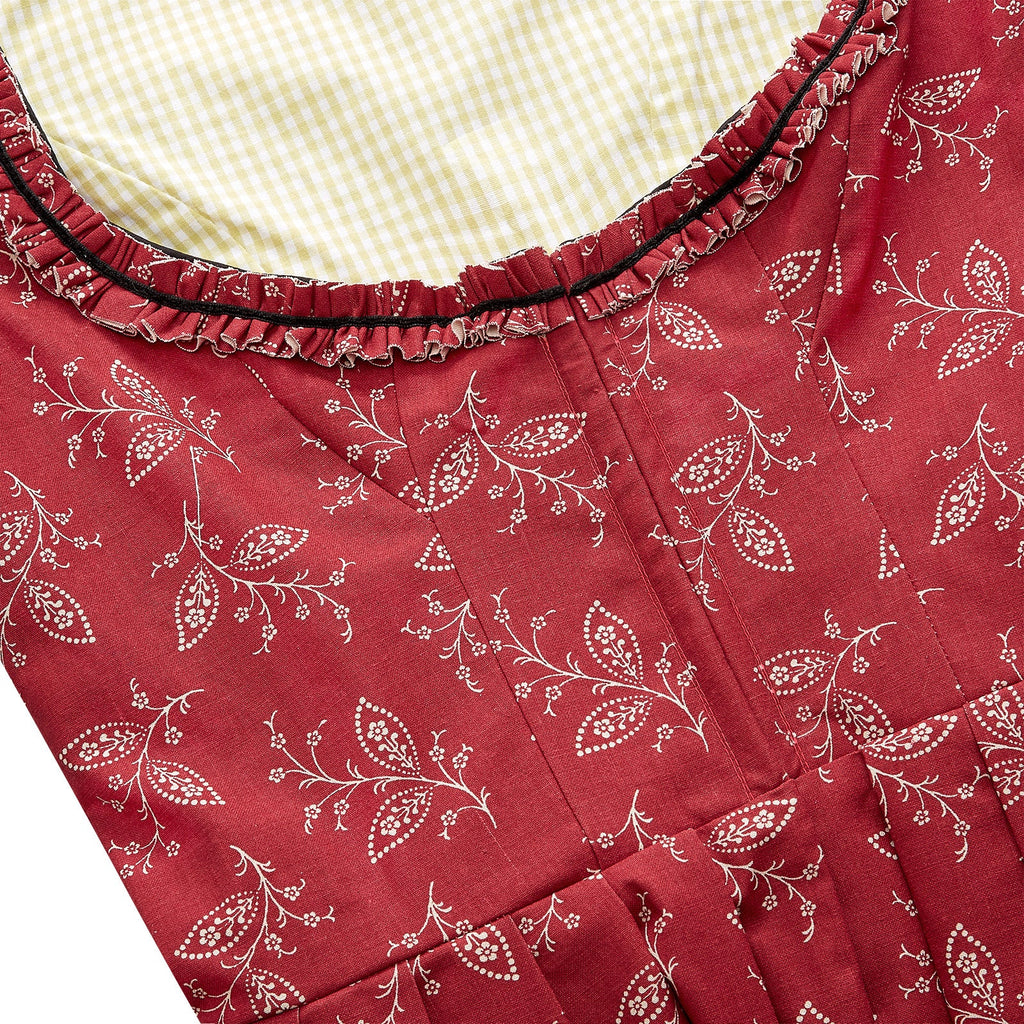 Utilizing her talents as a former designer for fashion, film, and opera productions, Bavarian-born Annina Pfuel married her love for traditional Alpine clothes with her expertise in historical costumes. Suitable across various dress codes, each handmade garment is a unique wardrobe investment, showcasing a modern-day sensibility while paying homage to a bygone era. Handcrafted from red printed cotton with a delicate floral motif, the Camilla Dress features ruffled trim around the neckline and black velvet ribbon detailing along the bodice and skirt—a timeless expression of Alpine romance and refined craftsmanship.
