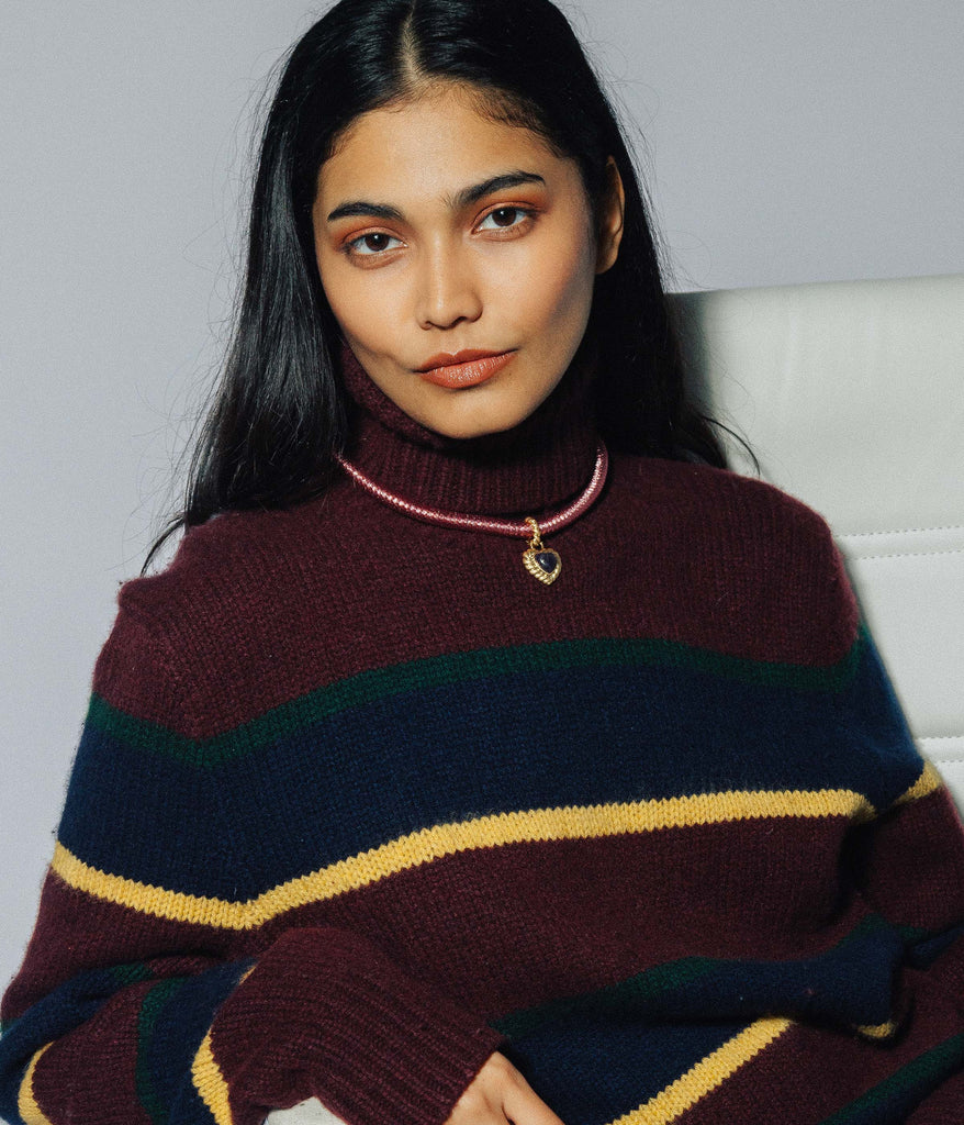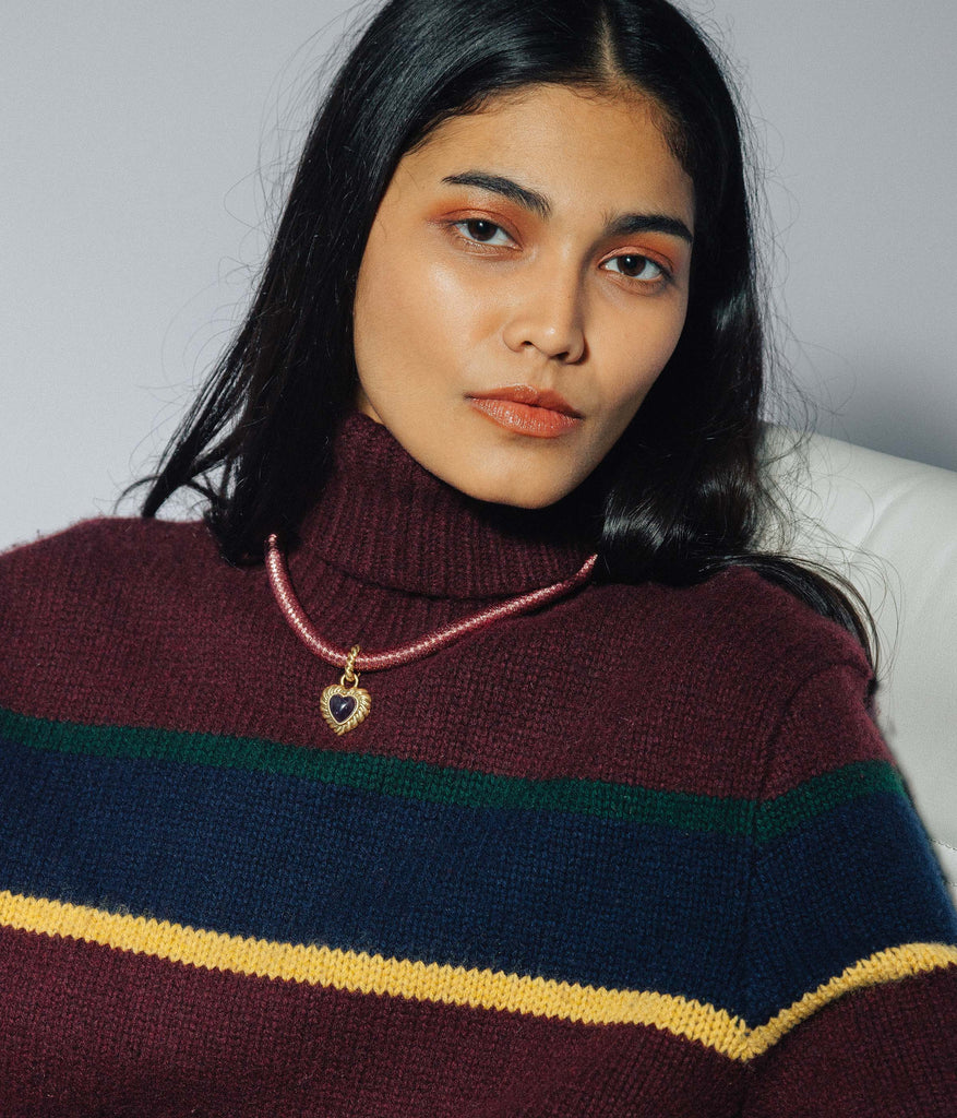 Loren Barham founded her jewelry line in 2005 as a means to reconnect with the vintage jewels that inspired her as a child. Today, the dynamic, artistic, original pieces of Loren Hope, designed at their flagship store in Newport, Rhode Island, serve as a bridge between nostalgia and thoroughly modern women everywhere. The Camille Amethyst Heart Necklace channels irresistible 1980s glamour with a puffy heart-shaped amethyst framed in textured gold and suspended from a metallic silk cord choker. The removable charm adds versatility, inviting endless styling possibilities—pair it with the Camille Amethyst Heart Studs and Camille Semi-Precious Heart Bangle for a complete, coordinated look.