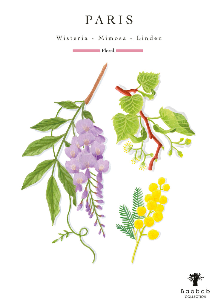 The My First Baobab Paris Candle celebrates the timeless elegance of the City of Light. Encased in a glass vessel decorated with a delicate gold and powder pink silkscreen design, it captures the romantic allure of Parisian streets in bloom. The scent opens with soft notes of wisteria, mimosa, and linden, creating a floral and luminous fragrance that feels both classic and modern.