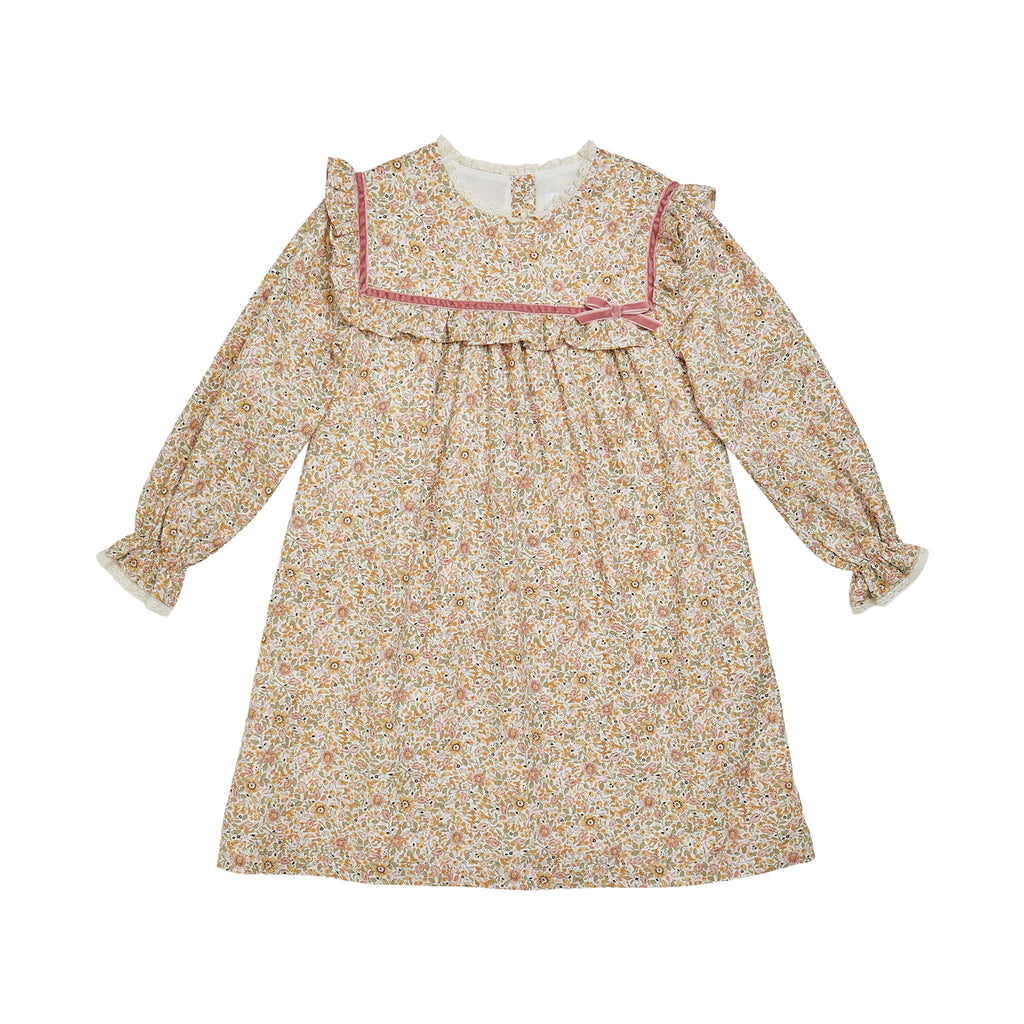 The Capucine Dress in Pink/Khaki Floral exudes refined charm and seasonal sophistication. Crafted from luxurious floral cotton, this long-sleeve dress features delicate lace accents and soft elasticated cuffs for comfort and ease. A contrasting dusty pink velvet trim frames the plastron frills, adding a touch of elegance to the classic silhouette. Perfect for the colder months, it pairs beautifully with ribbed tights and Amaia’s timeless Mary Jane shoes for a polished, graceful look suited to any occasion.