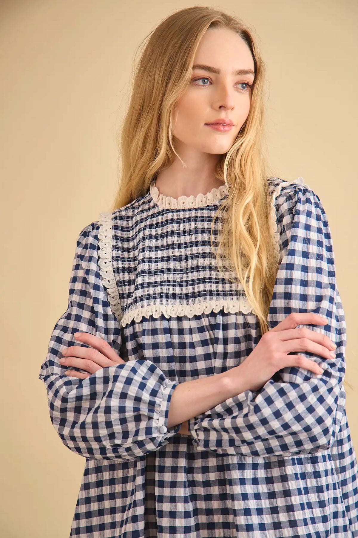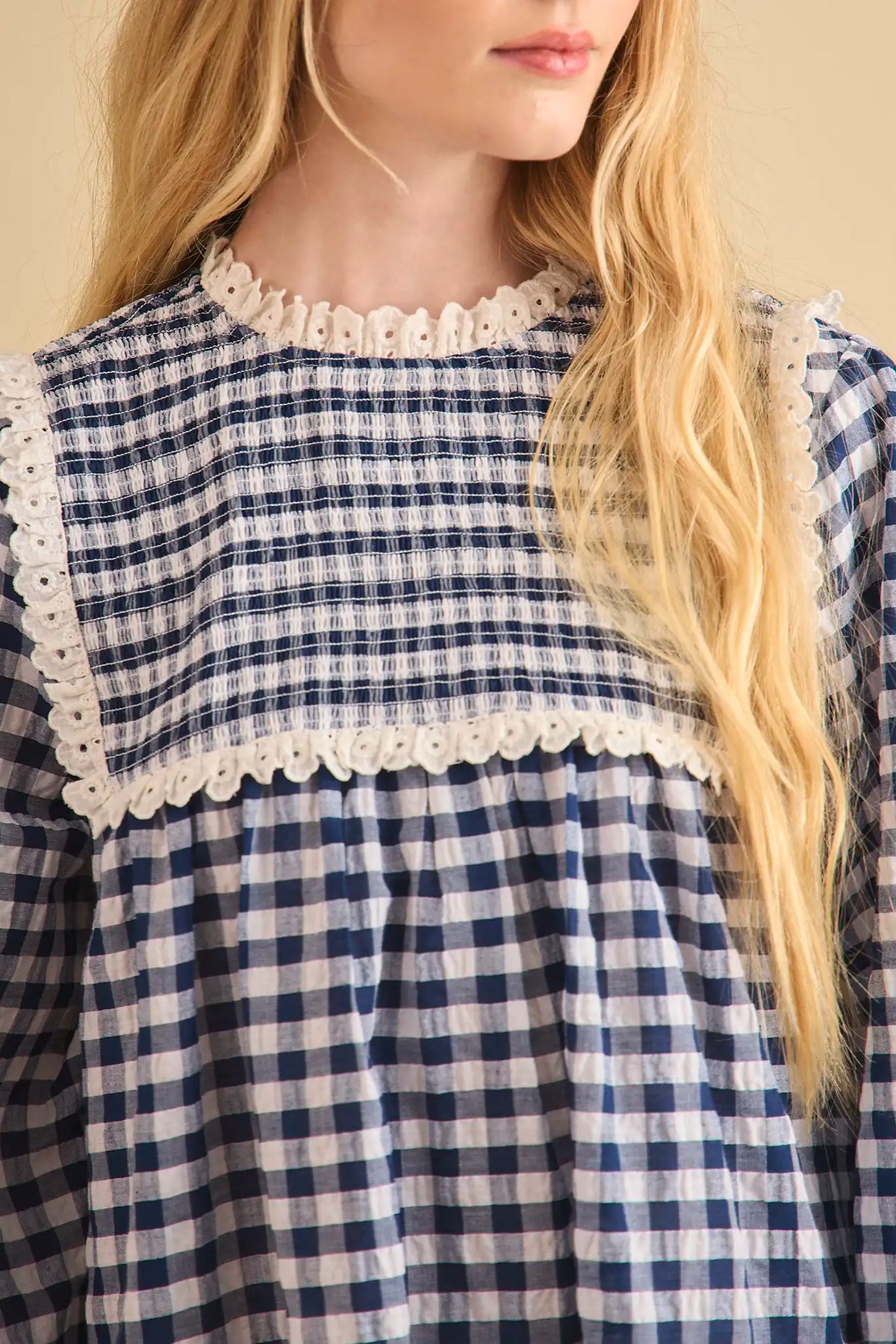 Hunter Bell strives to spark joy and inspiration with clothing that empowers women to embrace their personal style. The New York City–based label is all about fashion-forward, fun designs, crafted with meticulous detail and effortless wearability. The Carlyle Dress in Navy & White returns this season in a crisp blue and white gingham, elevated with feminine lace accents and thoughtful tailoring. Featuring a smocked yoke, long sleeves, and back button closure, this mini dress blends timeless charm with relaxed sophistication.