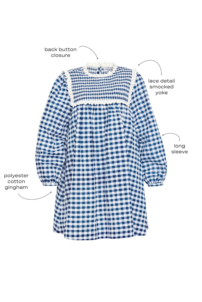 80% cotton, 20% polyester. Gingham cotton blend. Smocked yoke with lace detail. Long sleeves. Back button closure. Mini length. 35" length from top of shoulder.