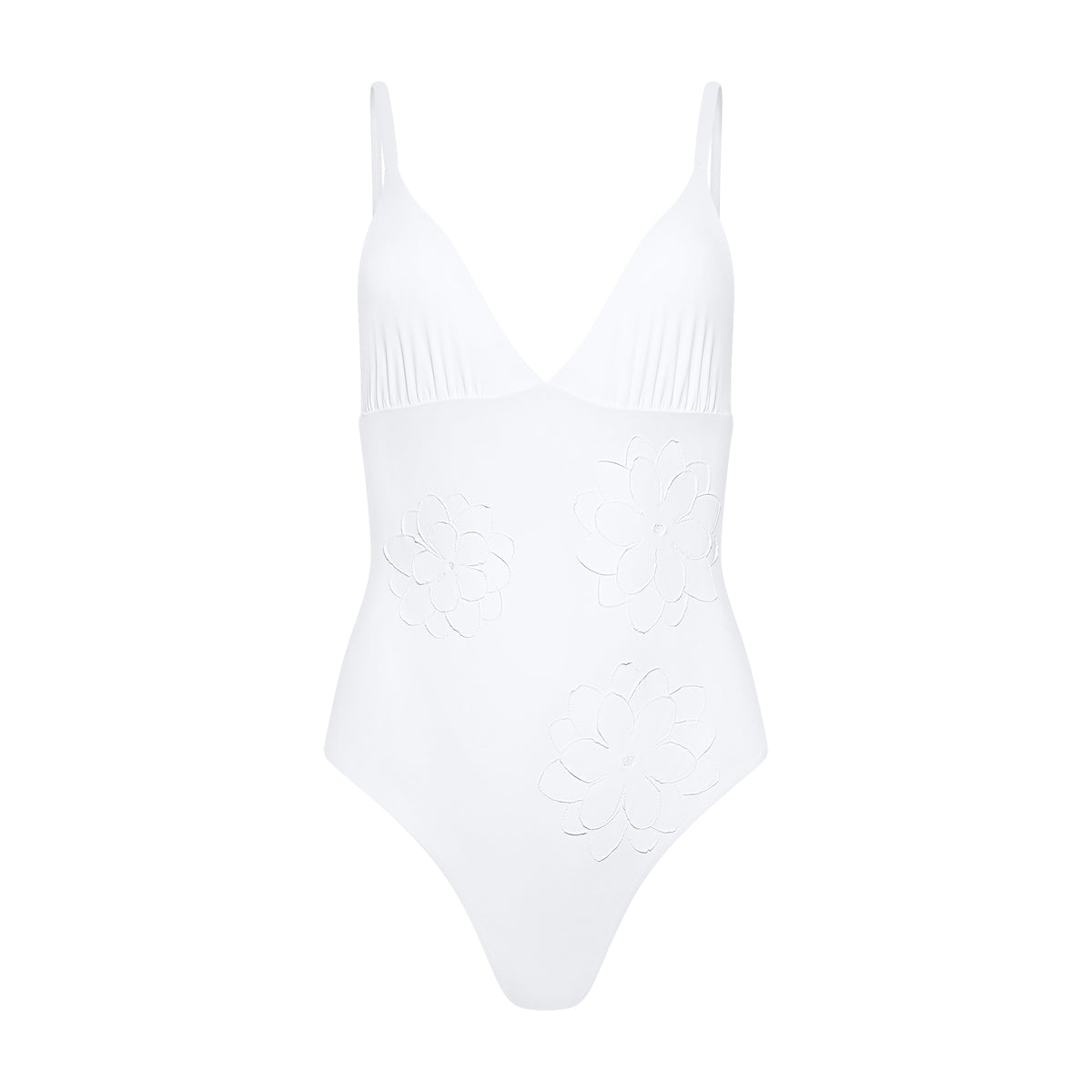Nostalgia for the past—Brigitte Bardot films, classic Cartier pieces, Slim Aarons photographs—guides the hand of Stefana Tabacaru, the designer of Tabacaru. Made in America, sustainably, each piece is created with flattering cuts, clean lines, and the finest materials to help women feel like the best version of themselves. Functioning as a one-piece and bodysuit, the Catherine can be worn with shorts, pants, skirts, and more. The floral appliqué provide the perfect finishing touch.