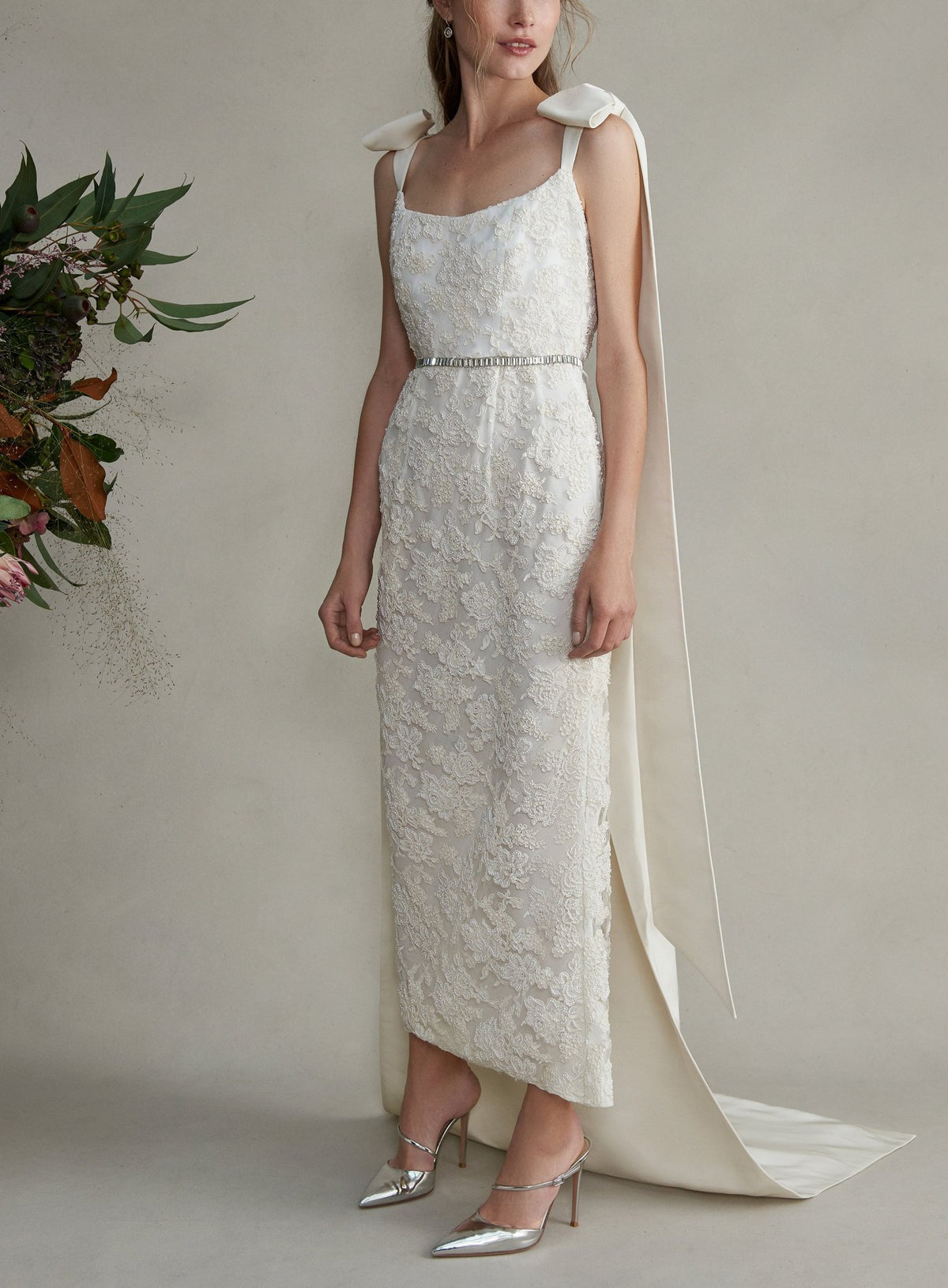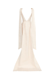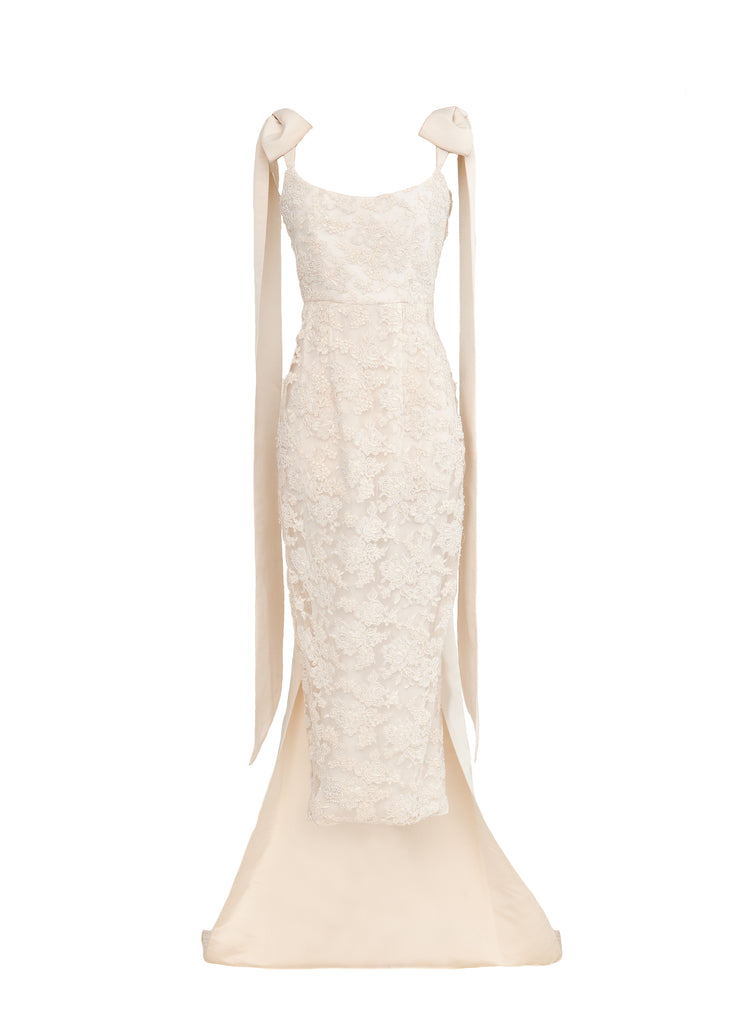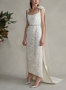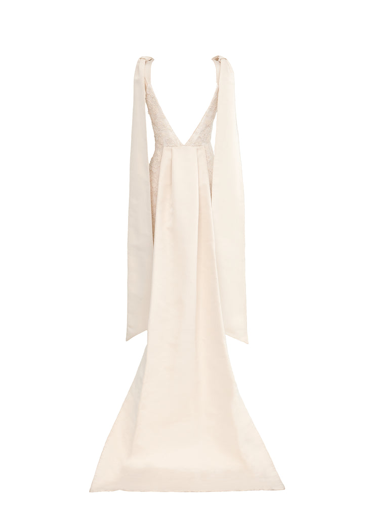 Named after a particularly radiant group of galaxies, Markarian combines designer Alexandra O’Neill’s love of the cosmos and celestial romanticism with timeless design and modern silhouettes. A forward-thinking approach to fashion and focus on fine craftsmanship mean Markarian is beautiful, well-made, and flattering. To that end, the Celestia Dress has a corseted shape with extended faille bows at the straps and a sweeping train that starts at the mid-back. It comes with a self-tie crystal-embellished belt.